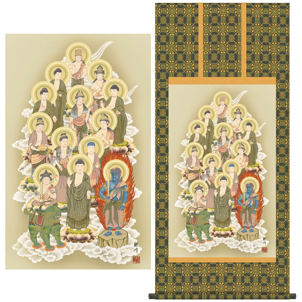 掛け軸 床の間 モダン 和風 仏事掛軸 尺五 十三佛 山村 観峰 三美会 54.5cm 約120cm 金襴丸表装 表装品質10年間保証 収納箱 防虫香 風鎮 付き 1/15以降順次発送