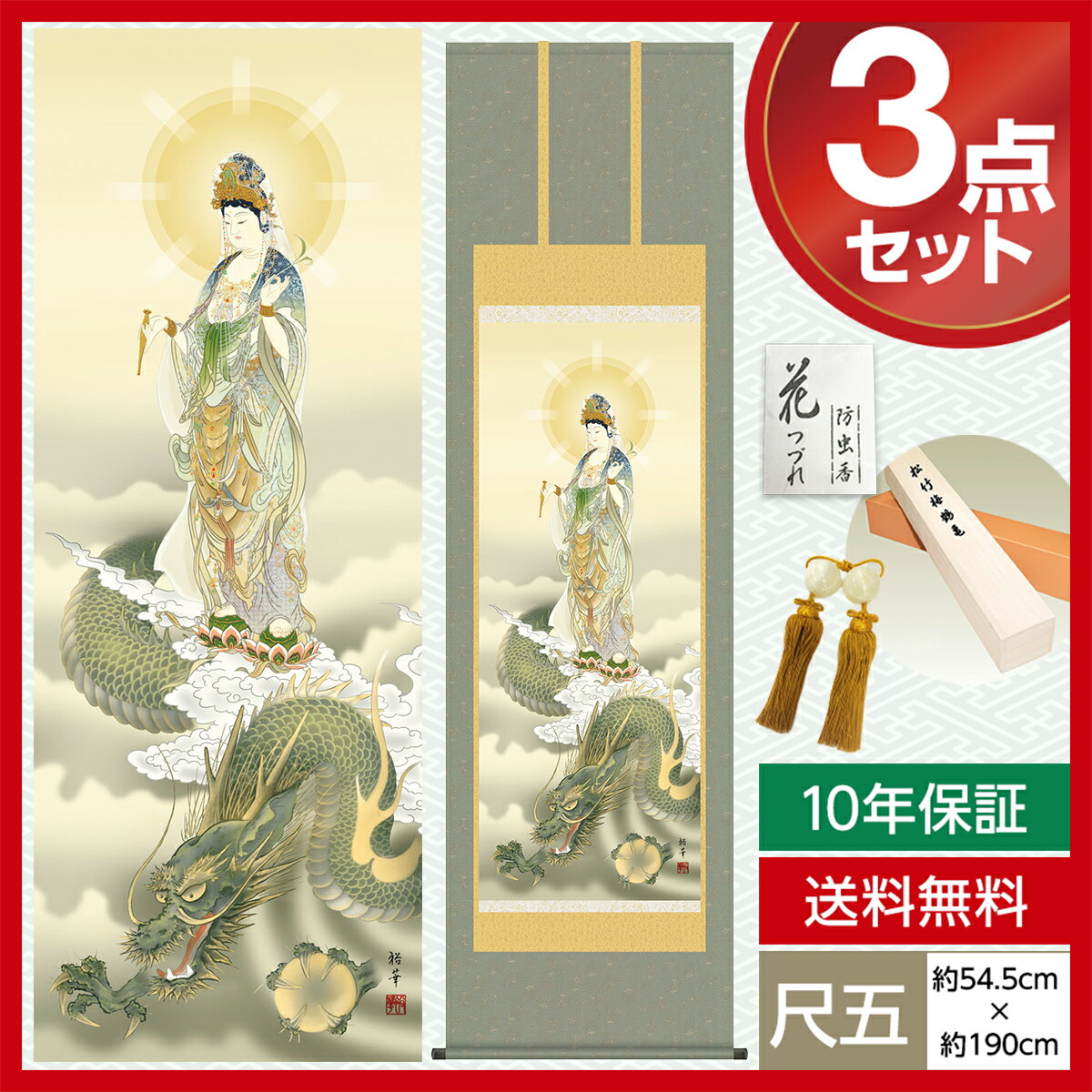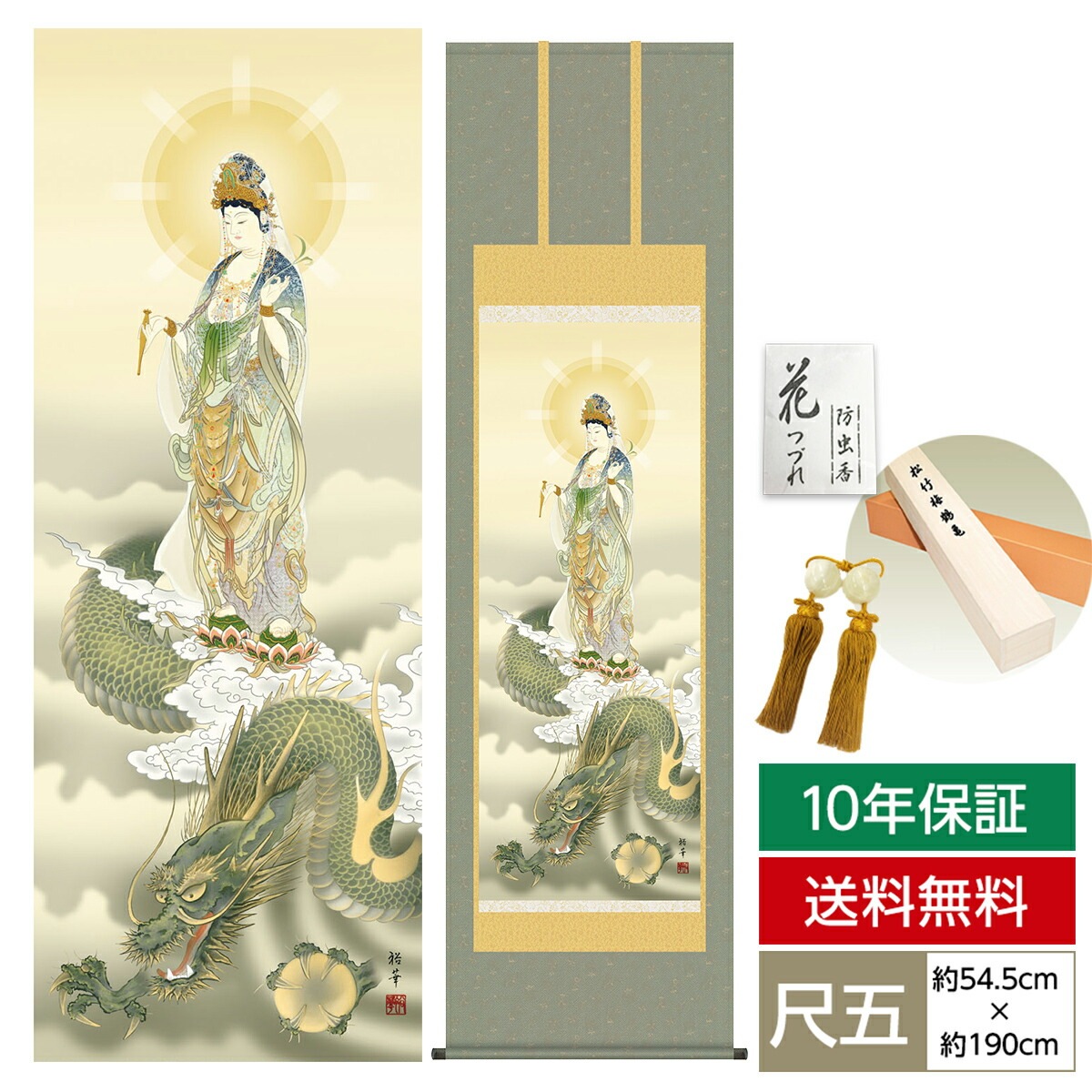掛け軸 床の間 モダン 和風 仏事掛軸 尺五 観音 龍上観音 北条 裕華 草夕会 約54.5cm 190cm 洛彩緞子佛表装 10年間保証 収納箱 防虫香 風鎮 付き 1/15以降順次発送