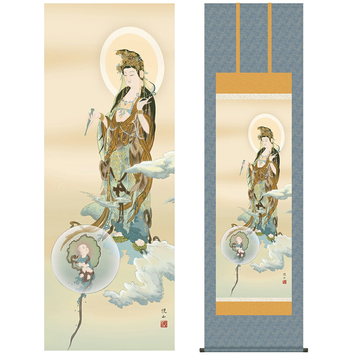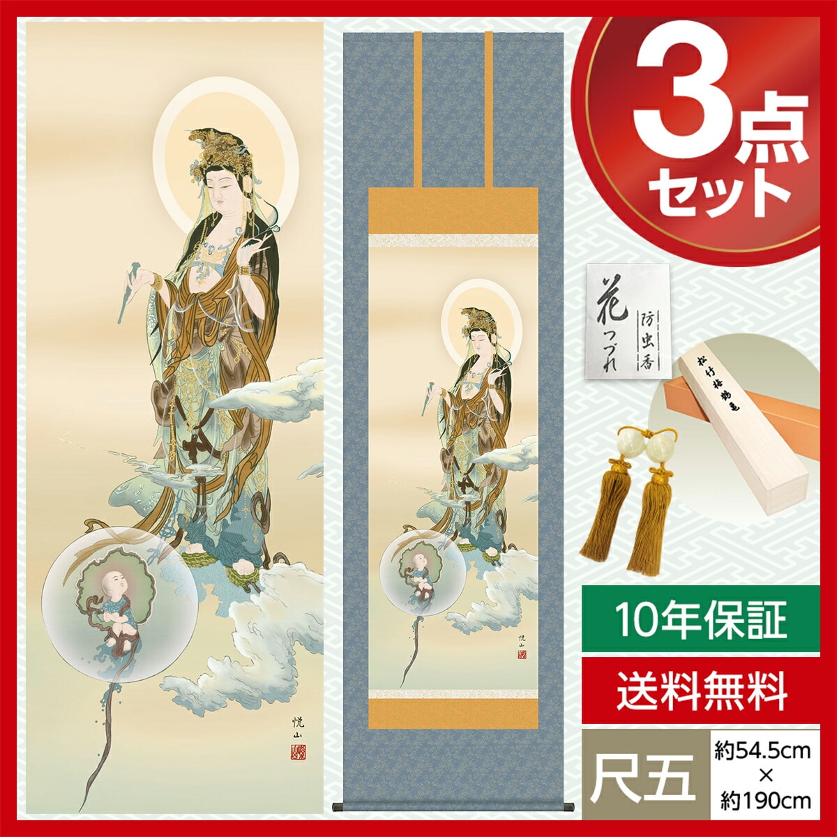 掛け軸 床の間 モダン 和風 仏事掛軸 尺五 観音 慈母観音 斎藤 悦山 竹翠会 約54.5cm 190cm 洛彩緞子佛表装 10年間保証 収納箱 防虫香 風鎮 付き 1/15以降順次発送