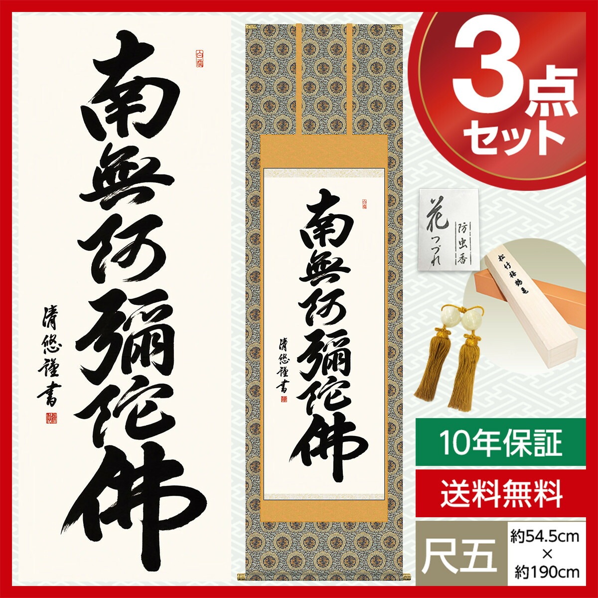 掛け軸 床の間 モダン 和風 尺五 南無阿弥陀仏 仏事 仏書 六字名号 吉田 清悠 三美会 約54.5cm 190cm 金襴本佛表装 10年間保証 収納箱 防虫香 風鎮 付き 1/15以降順次発送