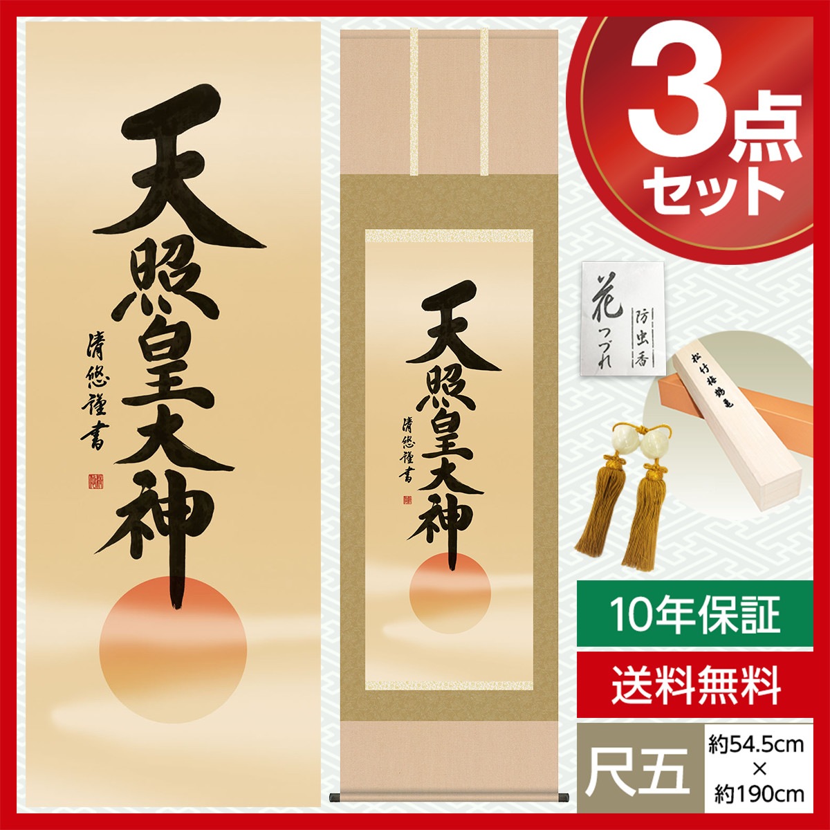 掛け軸 床の間 モダン 和風 尺五 天照皇大神 吉田 清悠 三美会 約54.5cm 190cm 洛彩緞子本表装 10年間保証 収納箱 防虫香 風鎮 付き 複製画 1/15以降順次発送