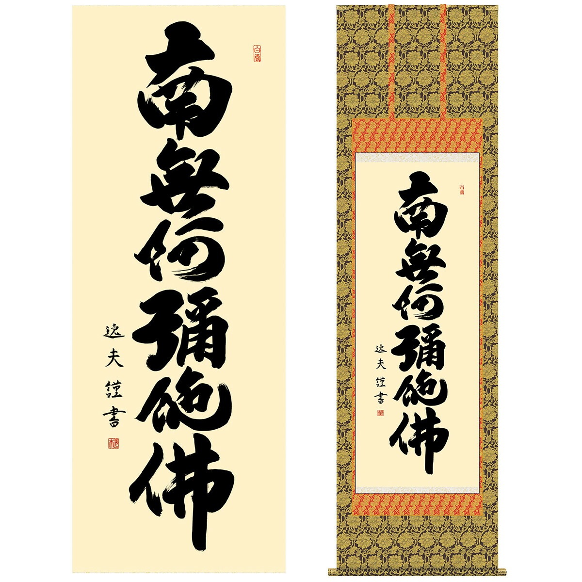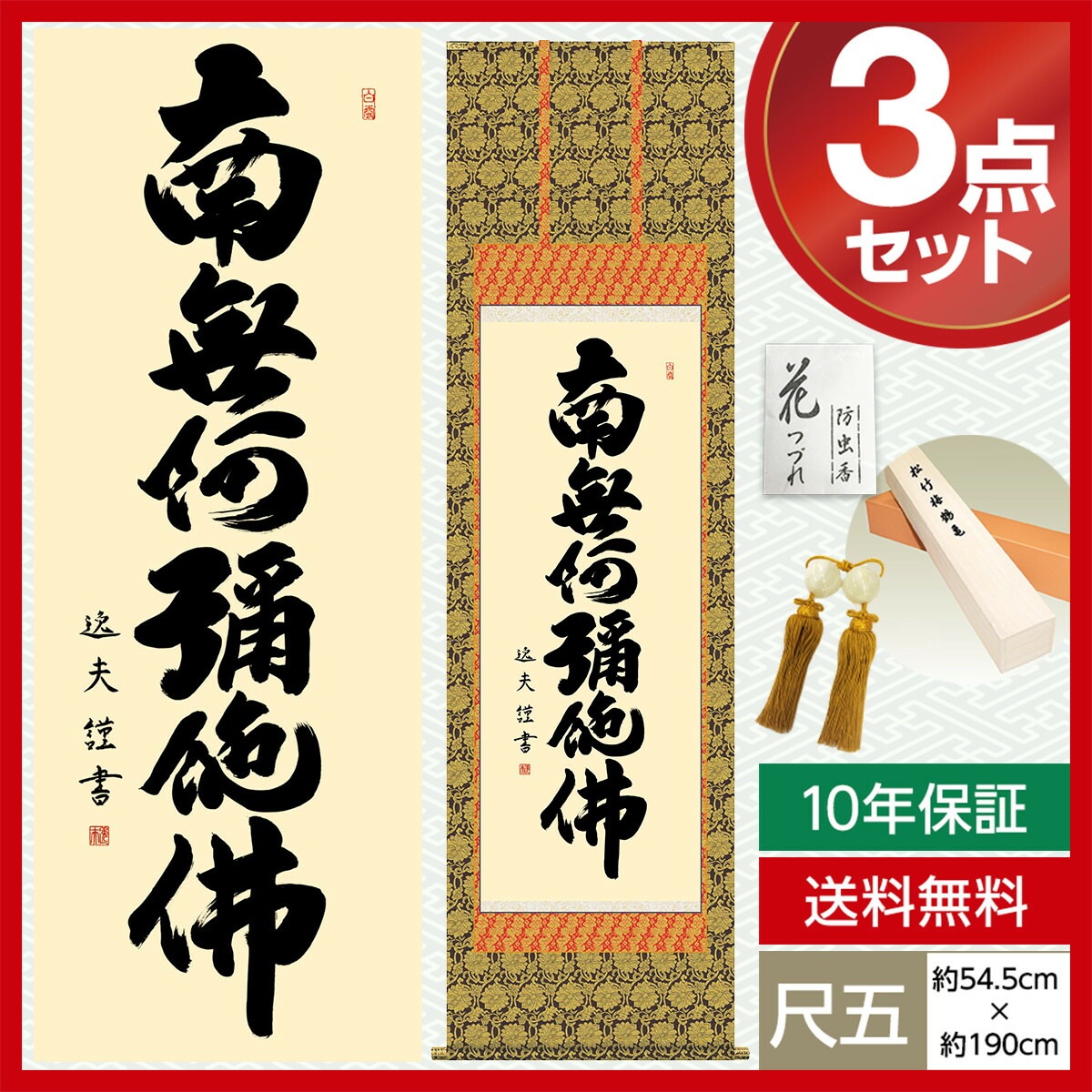 掛け軸 床の間 モダン 和風 仏事掛軸 尺五 仏書作品 南無阿弥陀仏 六字名号 中田 逸夫 三美会 約54.5cm 190cm 金襴本佛表装 10年間保証 収納箱 防虫香 風鎮 付き 1/15以降順次発送