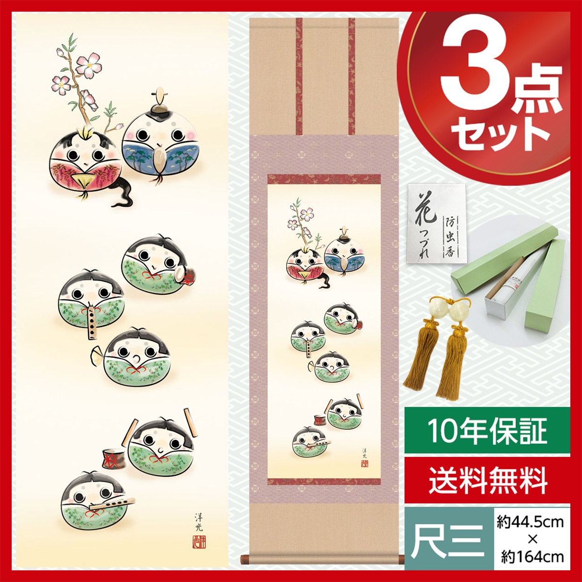 掛け軸 床の間 モダン 和風 尺三 桃の節句 だるま雛 井川 洋光 幸洋会 約44.5 164cm 洛彩緞子本表装 10年間保証 収納箱 防虫香 風鎮 付き 1/15以降順次発送