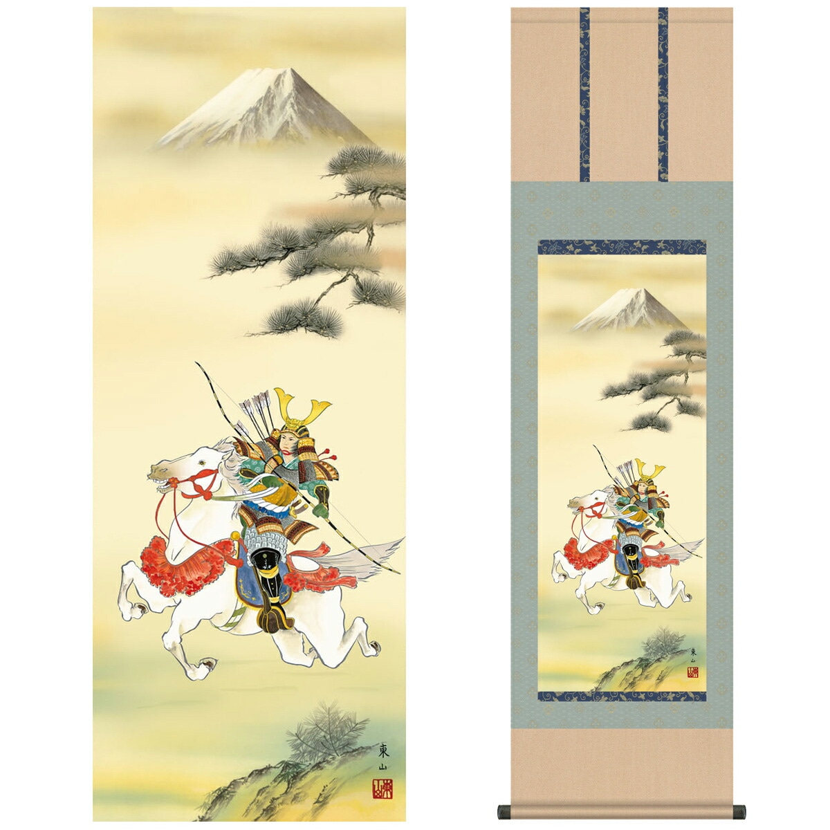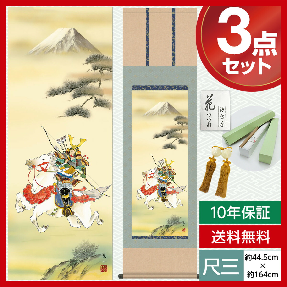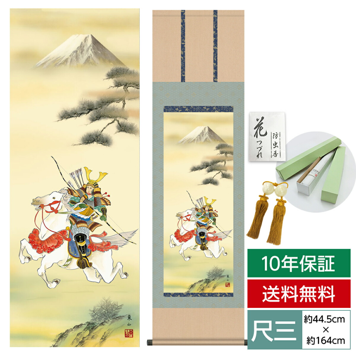 掛け軸 床の間 モダン 和風 尺三 端午の節句 白馬武者 榎本 東山 竹翠会 約44.5 164cm 洛彩緞子本表装 10年間保証 収納箱 防虫香 風鎮 付き 1/15以降順次発送