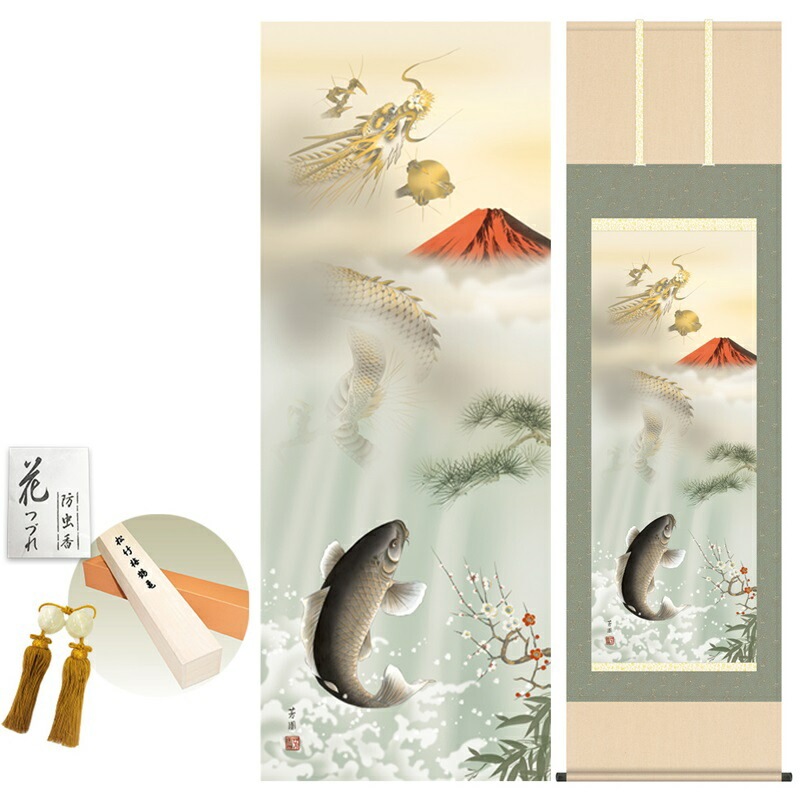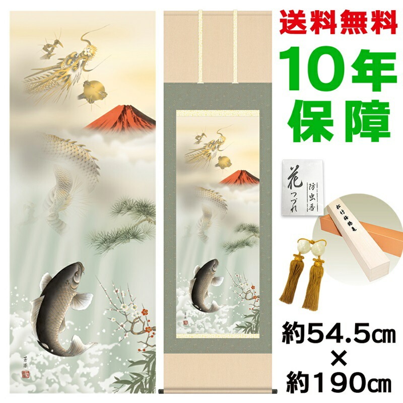 商品名 掛け軸 モダン 紅峰登龍門之図 石田芳園 洛彩緞子本表装 幅54.5×高さ約190cm 新絹本 表装品質10年間保証 掛け軸 モダン 収納箱 防虫香 風鎮 付き モダン おしゃれ かわいい