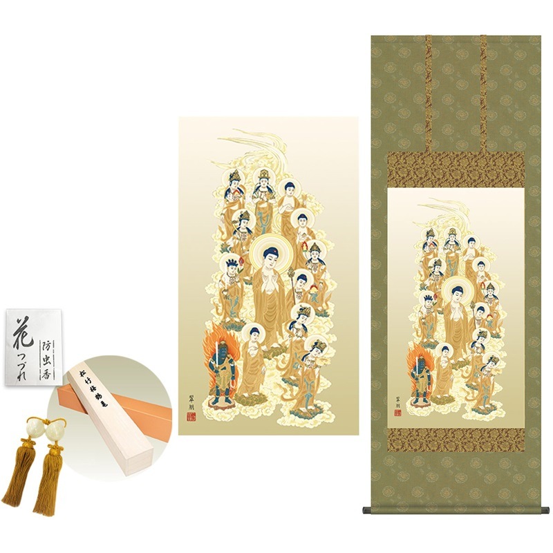 商品名 掛け軸 モダン 十三佛 鈴木翠朋 洛彩緞子佛表装 幅54.5×高さ約150cm 新絹本 表装品質10年間保証 掛け軸 モダン 収納箱 防虫香 風鎮 付き モダン おしゃれ かわいい