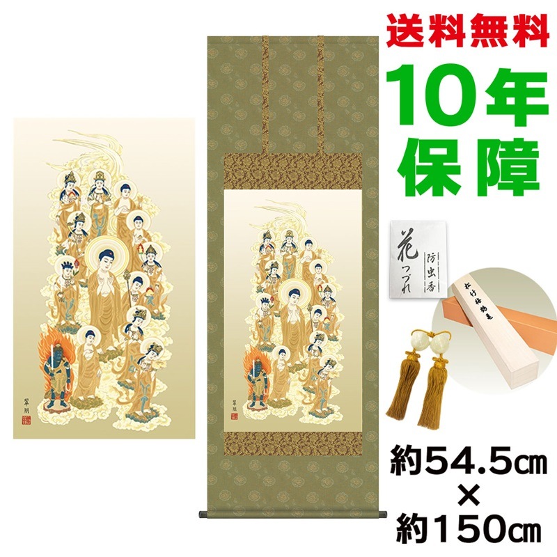 掛け軸 床の間 モダン 和風 尺五 十三佛 鈴木翠朋 洛彩緞子佛表装 約54.5 約150cm 新絹本 10年間保証 収納箱 防虫香 風鎮 付き 1/15以降順次発送