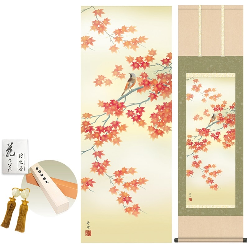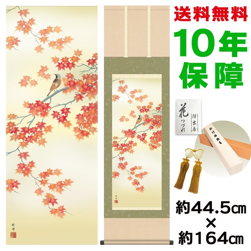 商品名 掛け軸 モダン 紅葉に小鳥 田村竹世 洛彩緞子本表装 幅44.5×高さ約164cm 新絹本 表装品質10年間保証 掛け軸 モダン 収納箱 防虫香 風鎮 付き モダン おしゃれ かわいい
