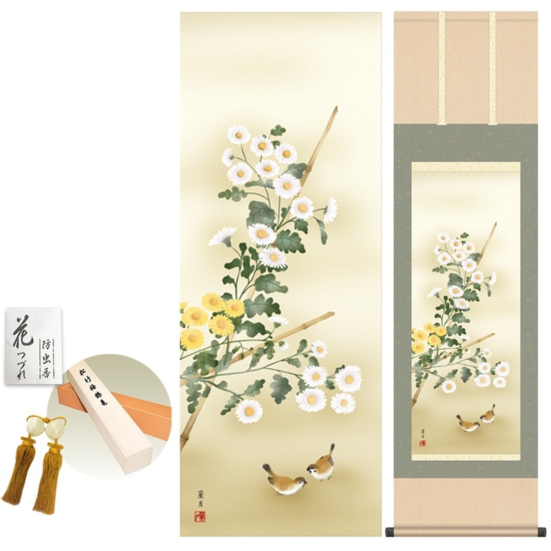 商品名 掛け軸 モダン 菊花 吉井蘭月 洛彩緞子本表装 幅44.5×高さ約164cm 新絹本 表装品質10年間保証 掛け軸 モダン 収納箱 防虫香 風鎮 付き モダン おしゃれ かわいい