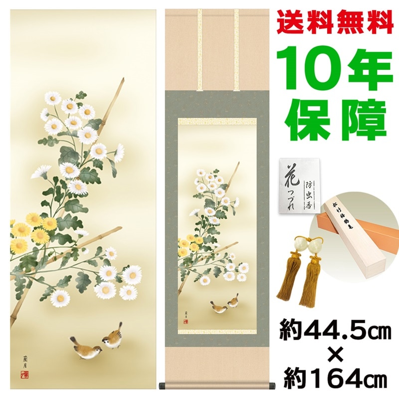 掛け軸 床の間 モダン 和風 菊花 吉井蘭月 洛彩緞子本表装 約44.5 164cm 新絹本 10年間保証 収納箱 防虫香 風鎮 付き 1/15以降順次発送