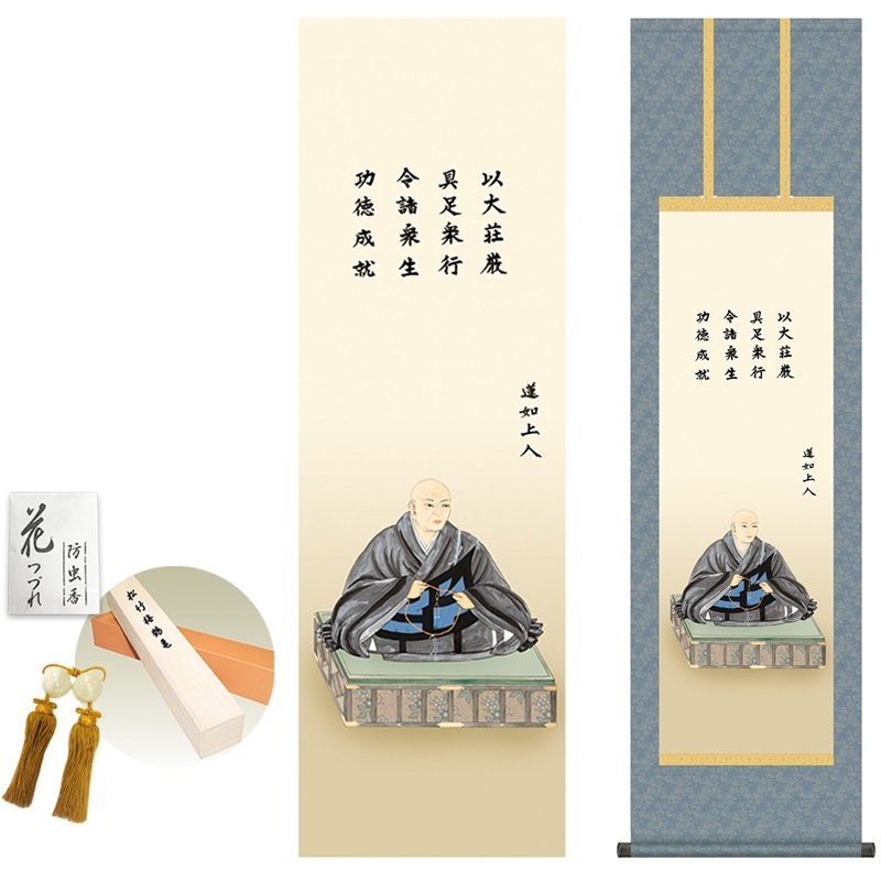 商品名 掛け軸 モダン 蓮如上人御影 大森宗華 洛彩緞子丸表装 幅44.5×高さ約164cm 新絹本 表装品質10年間保証 掛け軸 モダン 収納箱 防虫香 風鎮 付き モダン おしゃれ かわいい