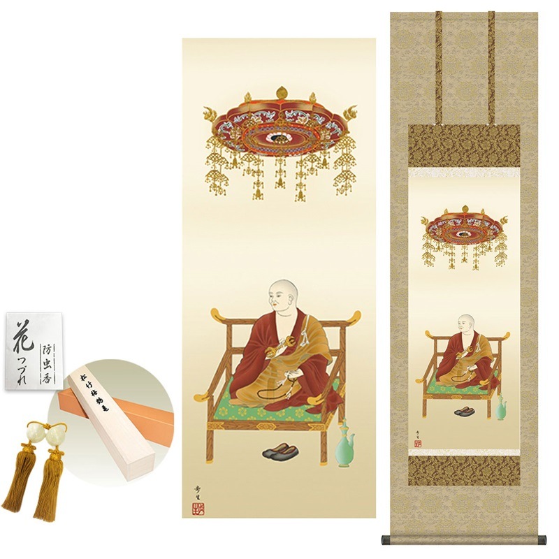 商品名 掛け軸 モダン 弘法大師 北山歩生 洛彩緞子佛表装 幅44.5×高さ約164cm 新絹本 表装品質10年間保証 掛け軸 モダン 収納箱 防虫香 風鎮 付き モダン おしゃれ かわいい