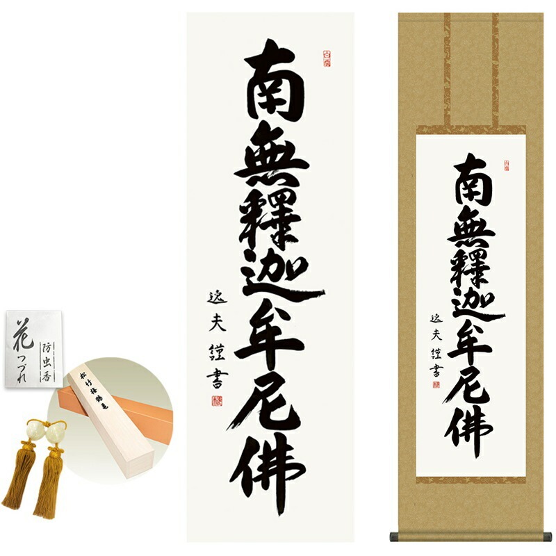 商品名 掛け軸 モダン 釈迦名号 中田逸夫 洛彩緞子丸表装 幅44.5×高さ約164cm 新絹本 表装品質10年間保証 掛け軸 モダン 収納箱 防虫香 風鎮 付き モダン おしゃれ かわいい