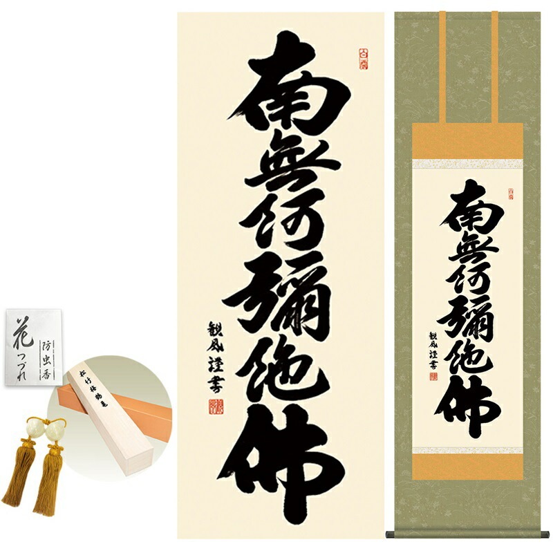 商品名 掛け軸 モダン 六字名号 浅田観風 洛彩緞子佛表装 幅44.5×高さ約164cm 新絹本 表装品質10年間保証 掛け軸 モダン 収納箱 防虫香 風鎮 付き モダン おしゃれ かわいい