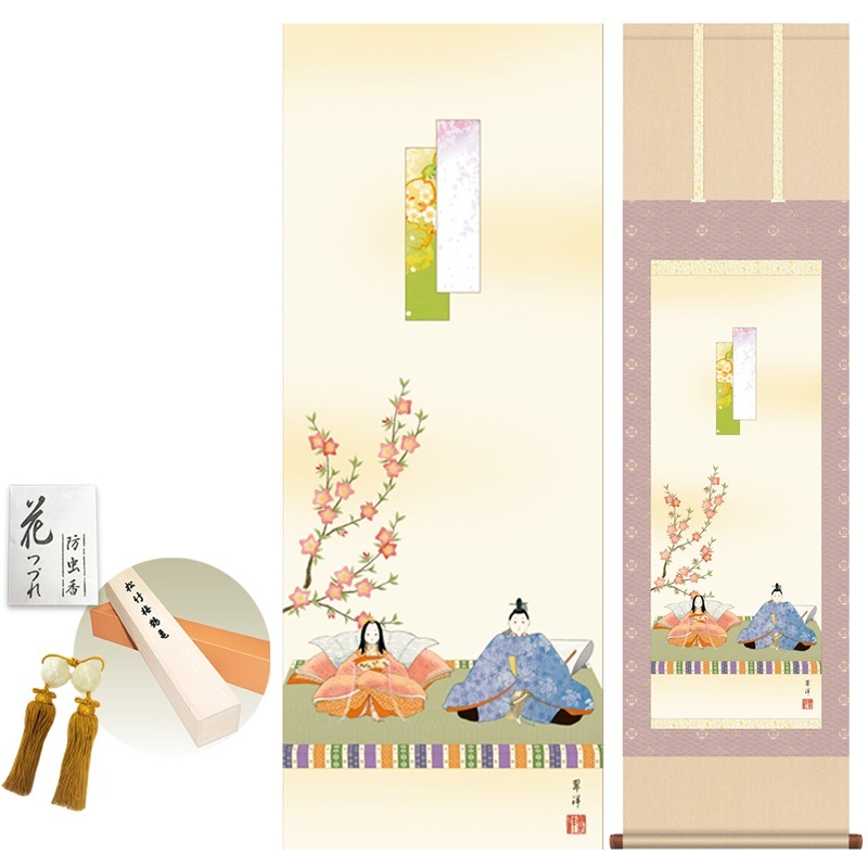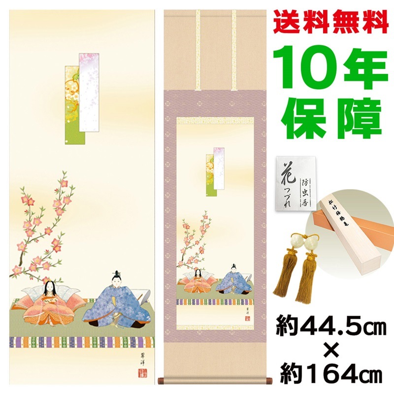 商品名 掛け軸 モダン 段雛 遠山翠洋 洛彩緞子本表装 幅44.5×高さ約164cm 新絹本 表装品質10年間保証 掛け軸 モダン 収納箱 防虫香 風鎮 付き モダン おしゃれ かわいい