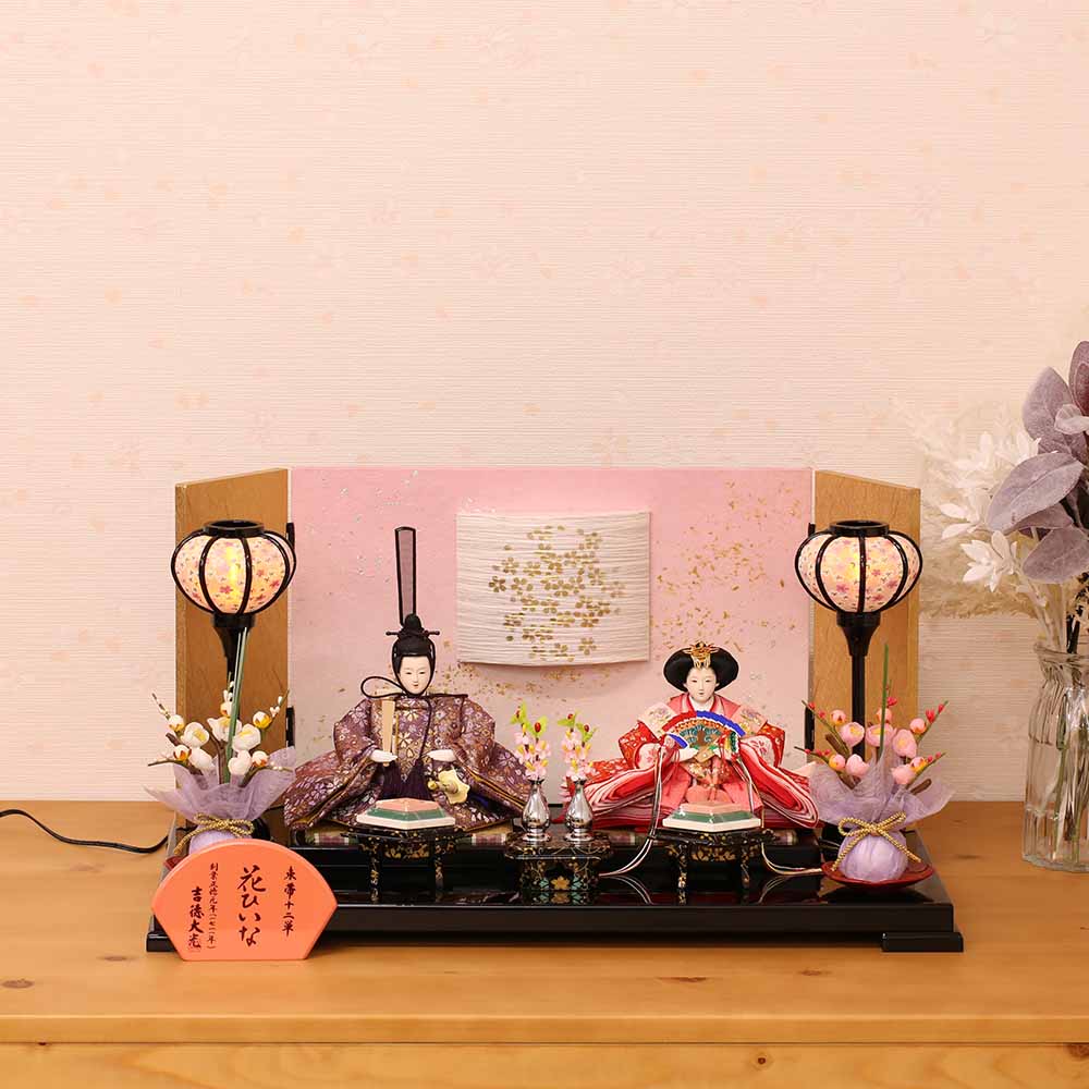 女の子のお節句らしい雰囲気の中に、和の粋なお洒落感がある親王飾り(二人飾り)の雛人形です。