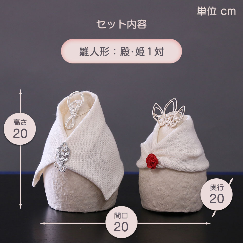 本体には和紙や紙糸、台座には未利用の間伐材が取り入れられ、自然由来で柔らかい印象の雛人形となっています。