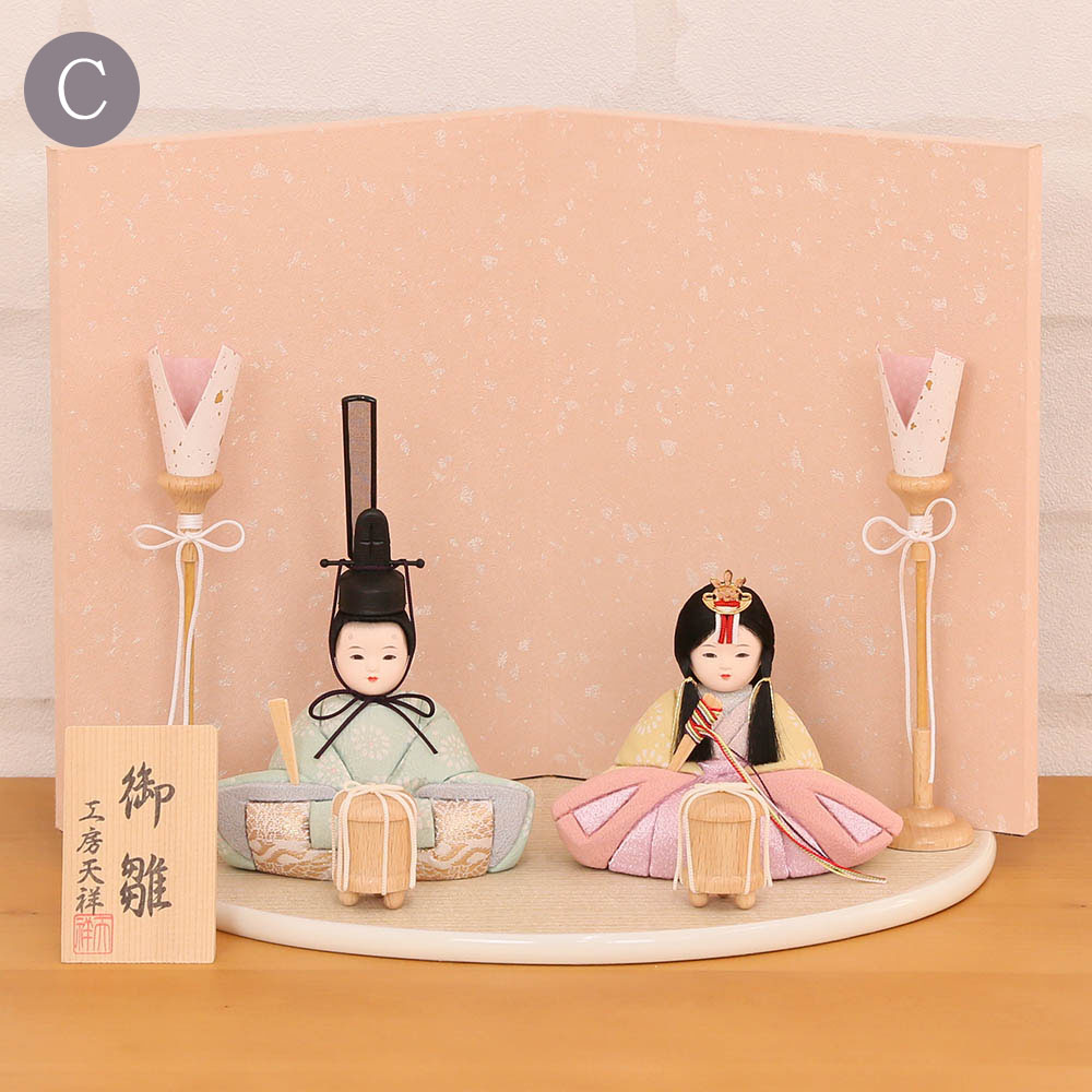 男雛には水色、女雛にはピンクのちりめんを用いた、華やぐキュートな衣装です。ピンク色の台と屏風によって女の子のお節句ならではの可愛らしさがアップした雛人形です。