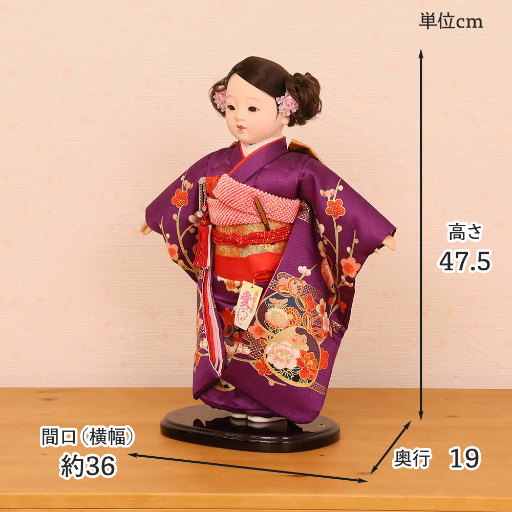 お人形は台に固定されております。台サイズ横幅19.5×奥行14.5(cm) 【B・C】約間口(横幅)38×奥行19×高さ47(cm)