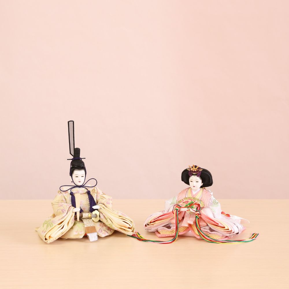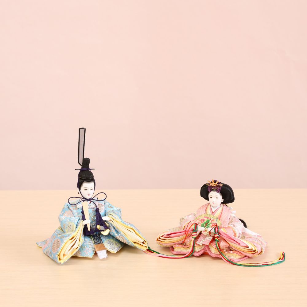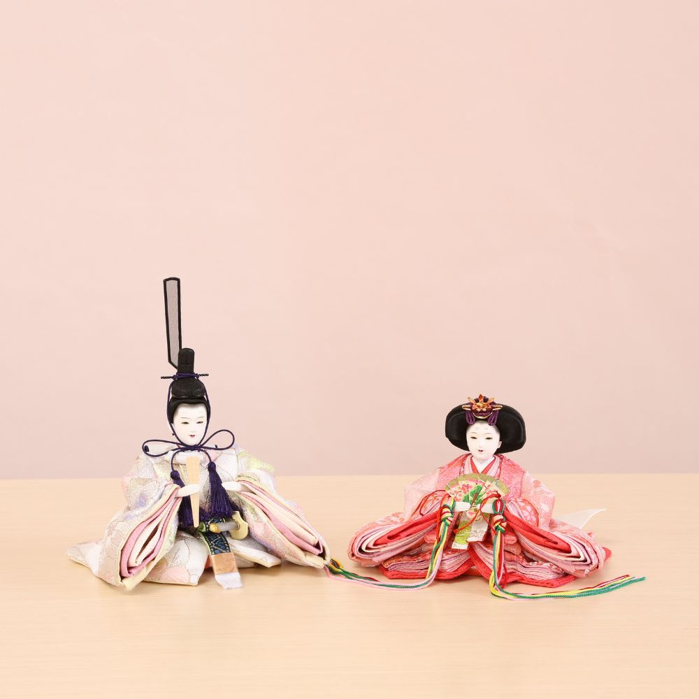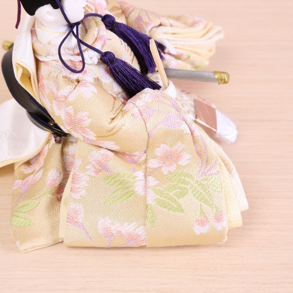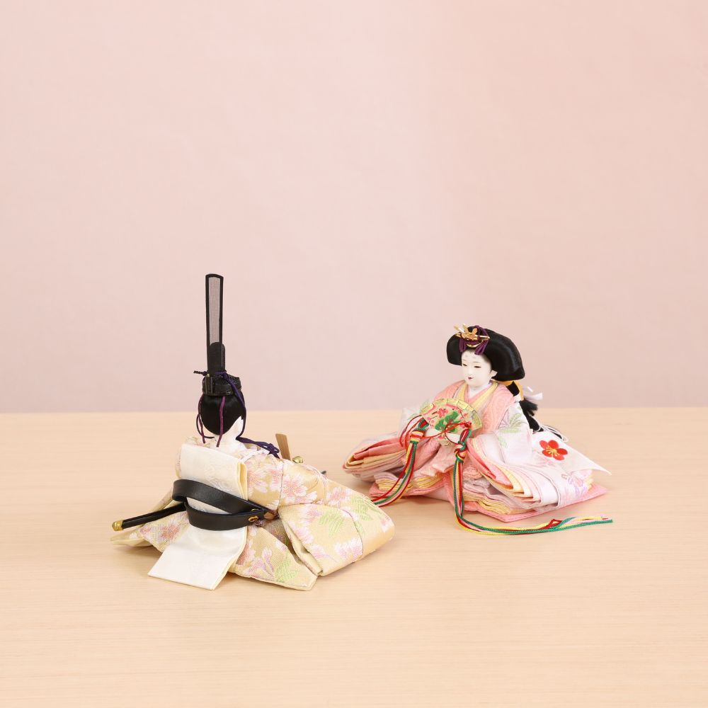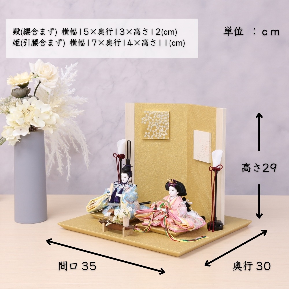 横幅35cmとコンパクトな台屏風セットに、京都西陣金襴織物のお着物をお召しになられた柳親王のお雛様を合わせました。 間口(横幅)35×奥行30×高さ29(cm) 女雛にはピンク色、男雛には淡い気品ある色合わせで、大胆な桜模様柄の京都西陣金襴織物の上質衣装をお召しになられたお雛様です。 古典的に桜柄が華やいだ京都西陣金襴織物のお衣装は、女雛にはピンク色、男雛には水色の春らしいパステルカラーが魅力的です。 女雛にはピンク色、男雛には淡い気品ある色合わせで、桜柄京都西陣金襴織物の上質衣装をお召しになられたお雛様です。