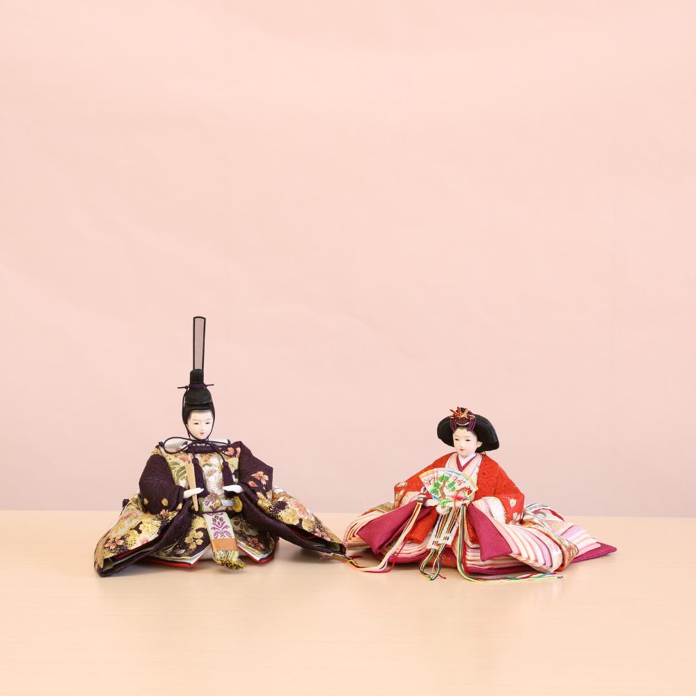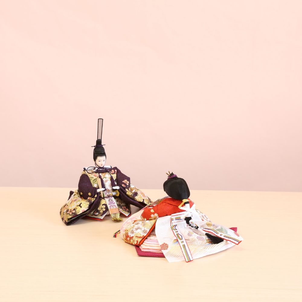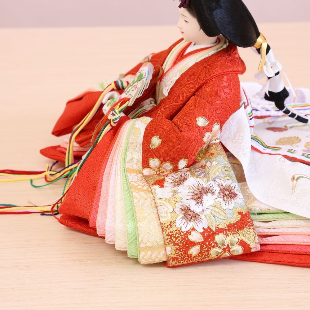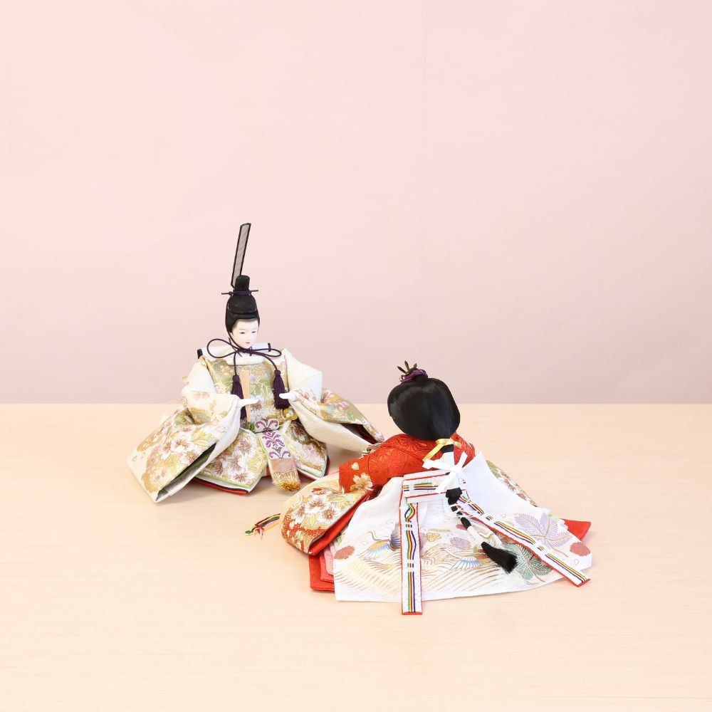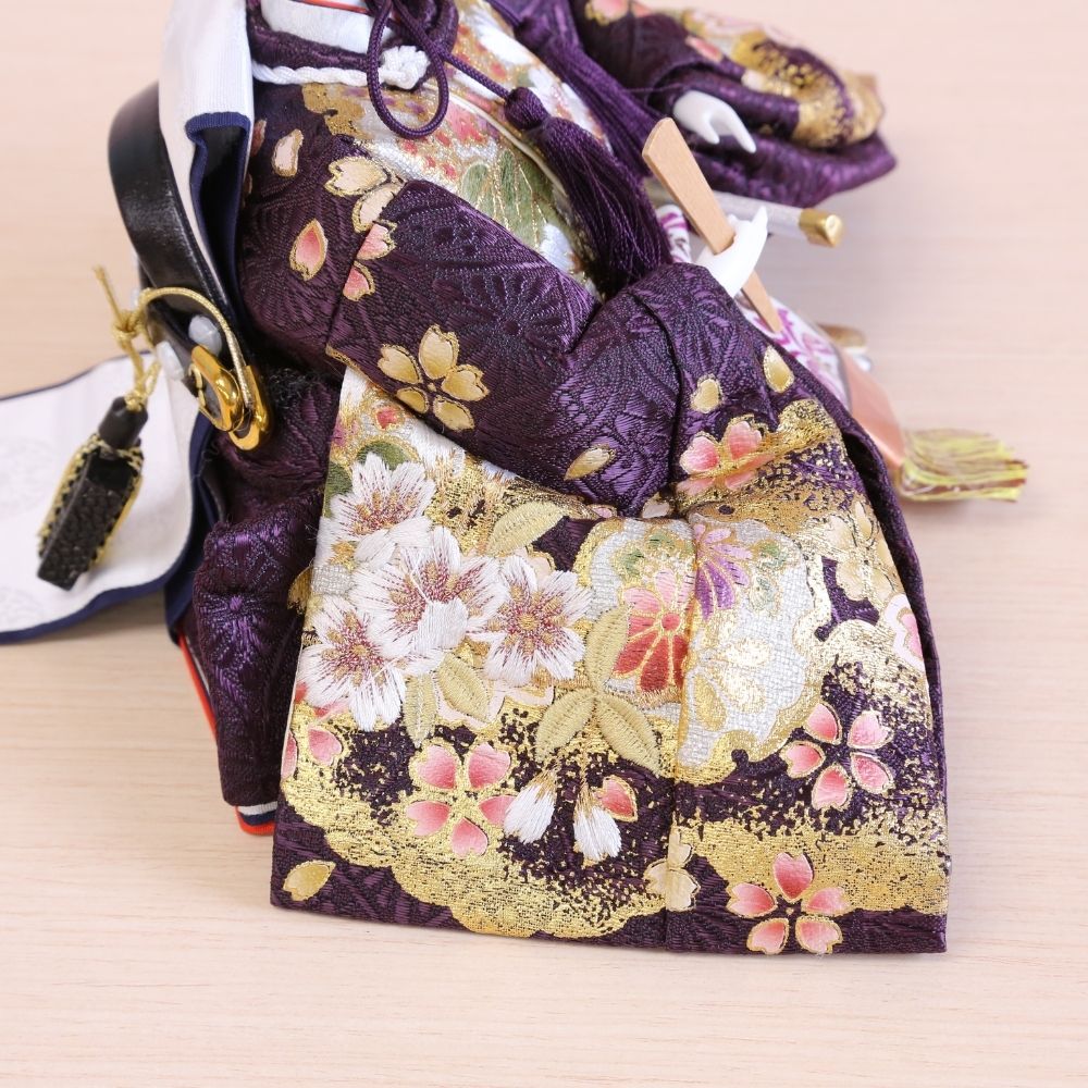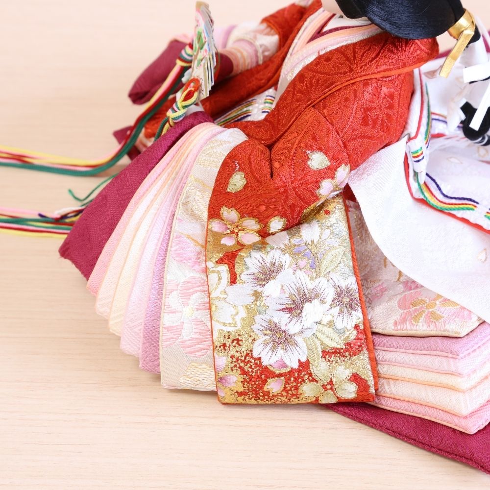 流糸白の屏風は、シンプルながらも京都西陣裂地からお仕立てしましたお雛様をより美しく際立てています。 間口(横幅)60×奥行35×高さ29(cm) 男雛には気品ある白地系、女雛には華やかな赤色地に桜柄の美しい刺繍です。さらに、この上に金彩加工をほどこして、見栄えの良さが目立つお衣裳の、小三五親王飾りに仕上げています。 男雛には濃紫色、女雛には華やかな赤色で、金彩加工がされた上にさらに桜柄の刺繍がほどこされた京都西陣織物の高級お衣裳です。