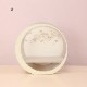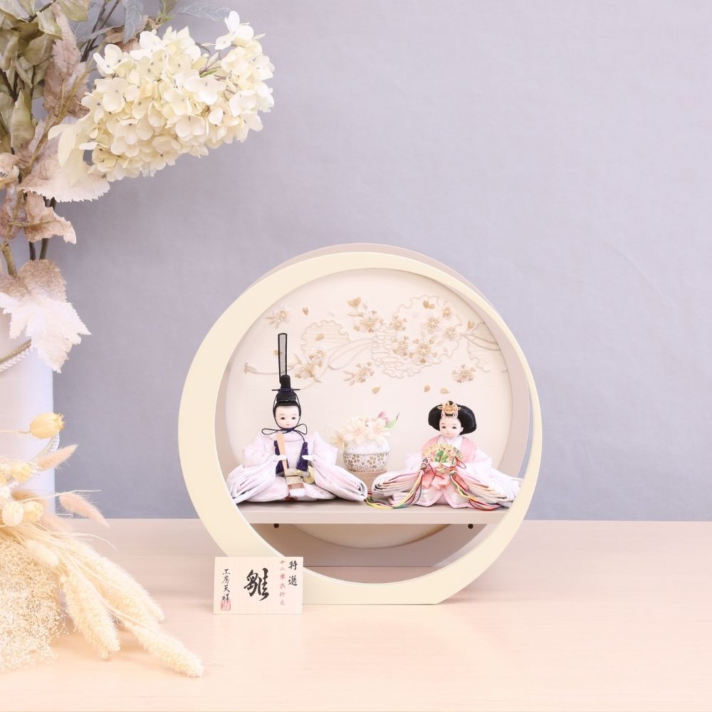 横幅36cmとコンパクトな台屏風セットに、男雛・女雛にともに淡いピンク色に桜の花びらが散る様子が織り出されたお着物のお雛様を合わせました。 人気のクリーム色・モカ系の台屏風セットは、バックには雪輪桜の刺繍がほどこされ、月の形をしたかわいいデザインで、現代のお部屋のインテリアにも馴染みがよい親王飾りです。 また、当店限定数のみのお顔でおめめが大きく、かわいい表情が魅力的。現代風に仕上げた雛人形です。 さらに、真ん中のお花飾りはスイッチ入れると灯りがつく、おしゃれな工夫が凝らされた雛人形飾りです。