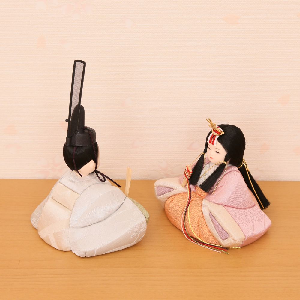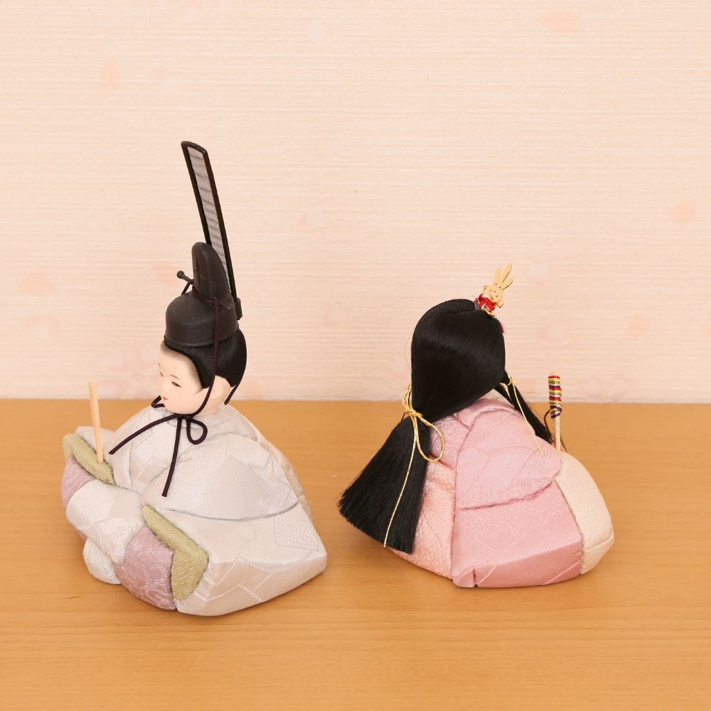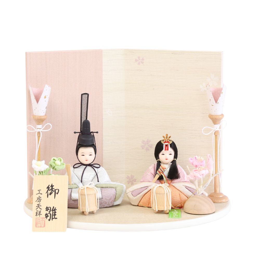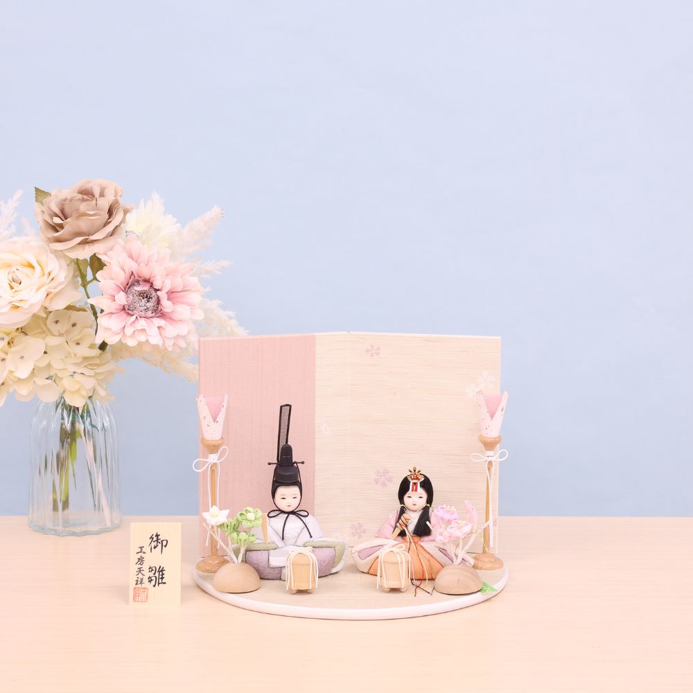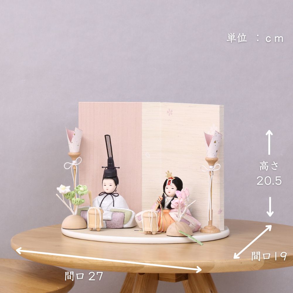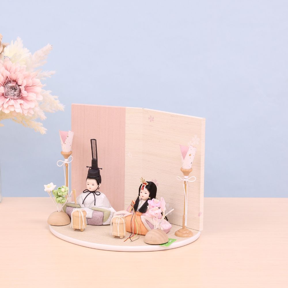 場所を選ぶことなくコンパクトにそして気軽に飾れる、現代のお住まいに適した、親王飾りの雛人形「ひらり」。 横幅27cmと小さいサイズに、和モダンな屏風をセットしました。 さらに、木製の貝桶や油灯、ちりめん細工の桜橘も付いて、小さいながらも存在感たっぷりです。 また、割り毛タイプのお下げ髪の女雛は、愛らしいお顔が魅力的。 男雛が淡い水色、女雛にはピンク色の西陣裂地、上質素材を用いています。 そして、くすみピンク色のポイントカラーと小桜柄デザインの屏風によって、北欧風スタイルでおしゃれに飾って頂ける木目込み雛人形に仕上がっています。 「ひらりシリーズ」商品詳細説明 ひらりひらりと桜の花が舞う季節、かわいいコンパクトサイズの雛人形が新登場。 「ひらりシリーズ」の雛人形は、手のひらにおさまる小さな木目込み雛人形です。 筋彫りに布地を埋め込んで、まるで衣裳を着ているかのように仕立てる、職人の手仕事による雛人形です。