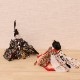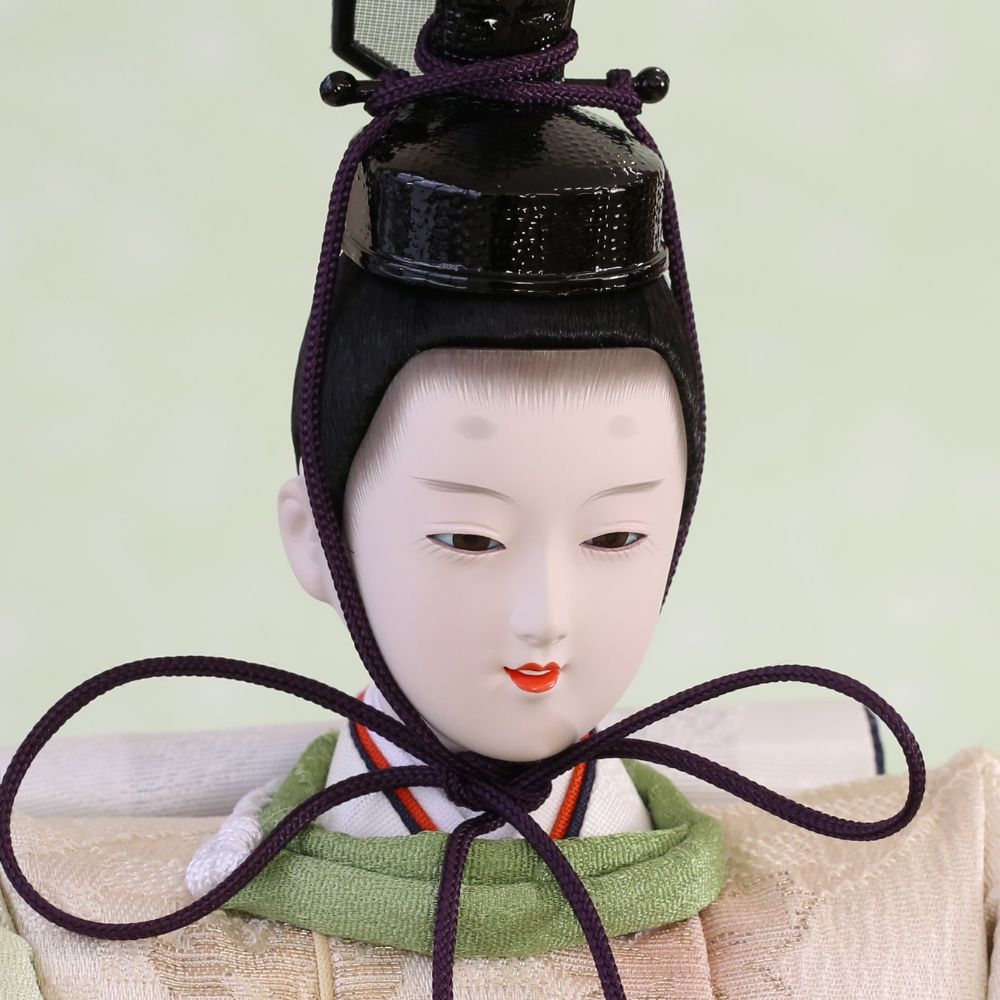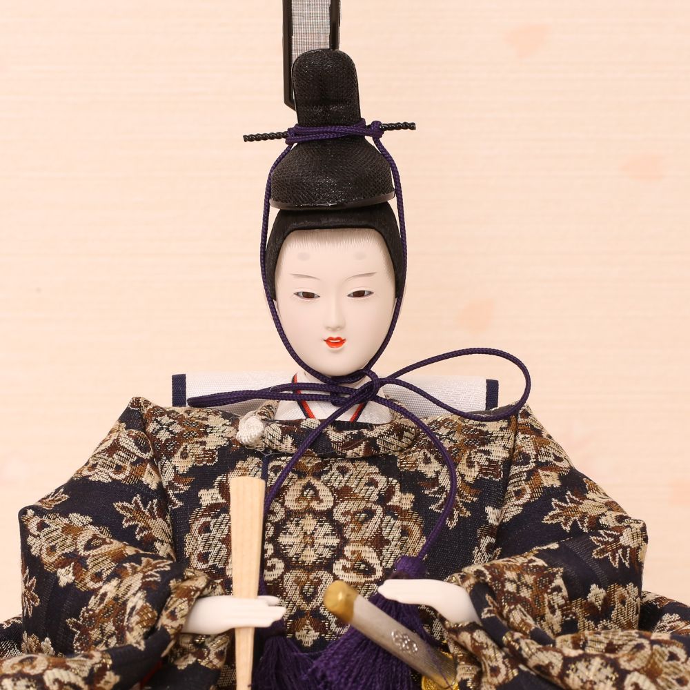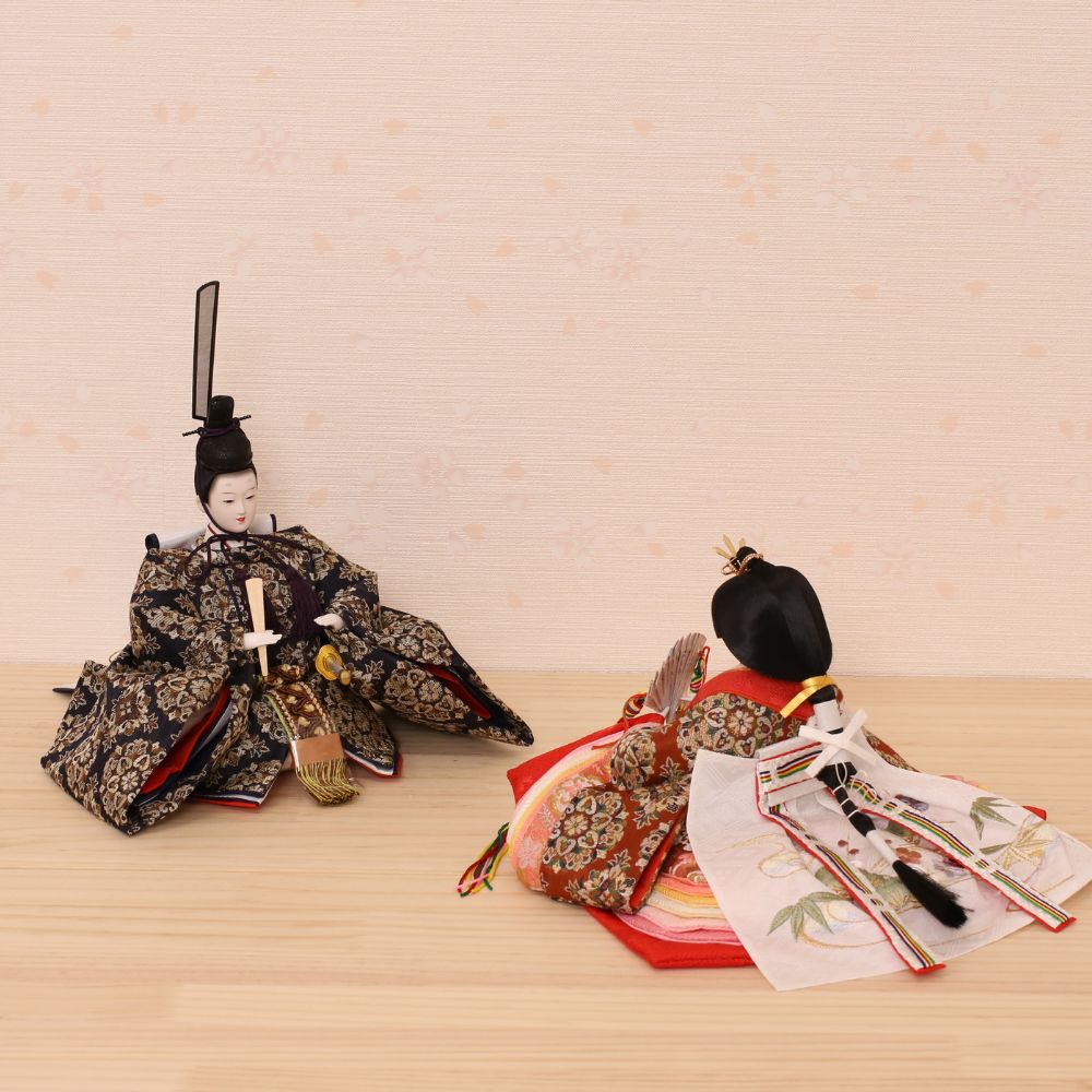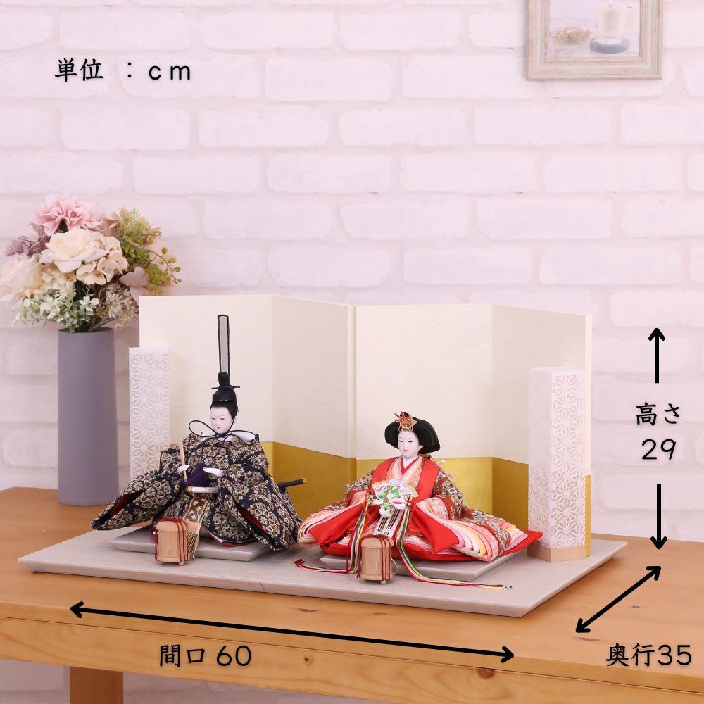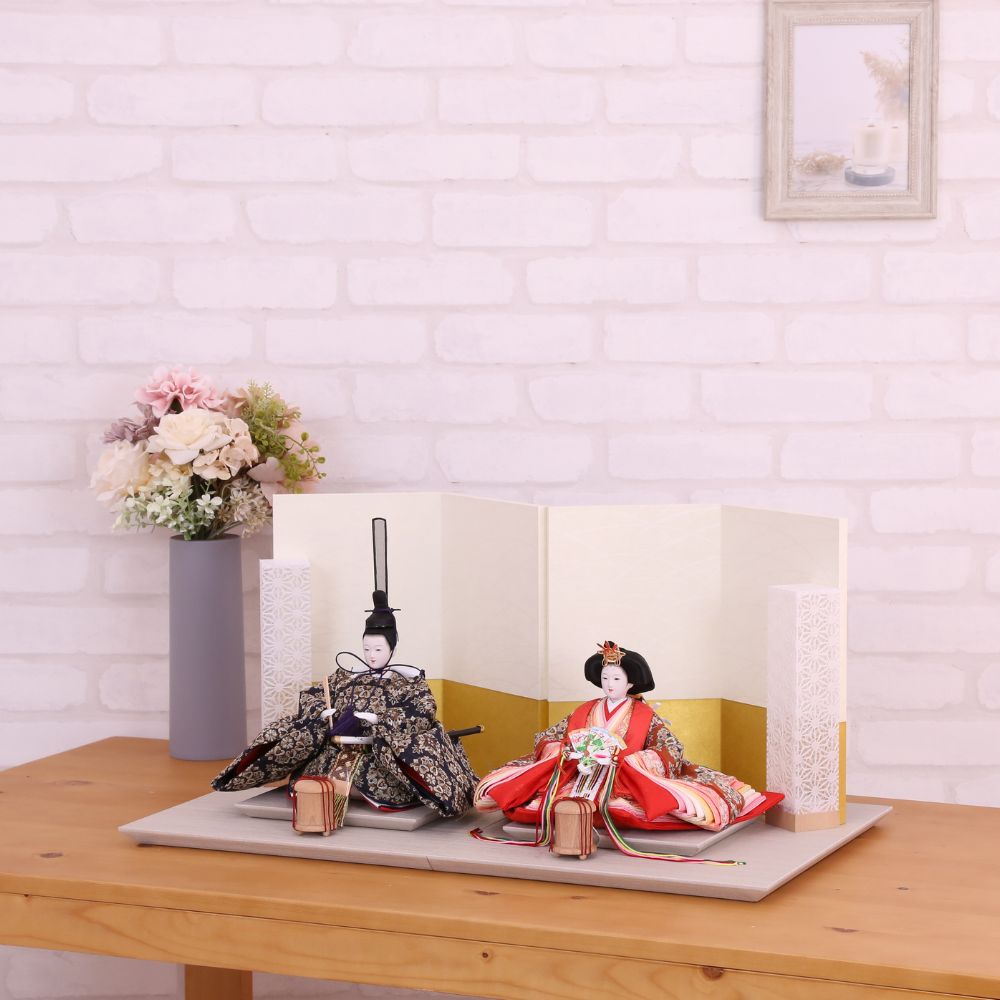 露草柄の白に金彩ラインが入った、おしゃれな屏風に、一目で分かる上質感、正絹帯の衣装のお雛様を合わせた、小三五親王飾り「新古今雛」です。 上質なお衣裳とモダンな台屏風セットで、初節句はもちろん、大人になってからも豪華に飾って頂ける逸品です。 また、男雛には濃紺、女雛には朱赤に吉祥紋様柄が織り出された正絹帯から仕立てた、高級雛人形です。 従来の雛人形は、ひな人形用に仕立てられた生地を裁断して人形に着せつけていますが、こちらの「新古今雛シリーズ」のお雛様は、人が身につける帯や反物をバッサリと贅沢に裁断して製作をする、豪華な高級ひな人形です。 そして、お顔は凛とした高貴な表情をたたえた、工房天祥オリジナルの頭(かしら)を採用したお雛様です。 ◆人形制作詳細 頭 着付 髪付:工房天祥 ◆衣裳 正絹織物(名古屋帯) 伝統的紋様柄 ◆台屏風 60cm流糸黒台(二枚組み) つゆ草白に金彩屏風 ◆お道具 25号木製貝桶 21cm 角型行灯(コードレス) ◆サイズ詳細 間口(横幅)60×36×29