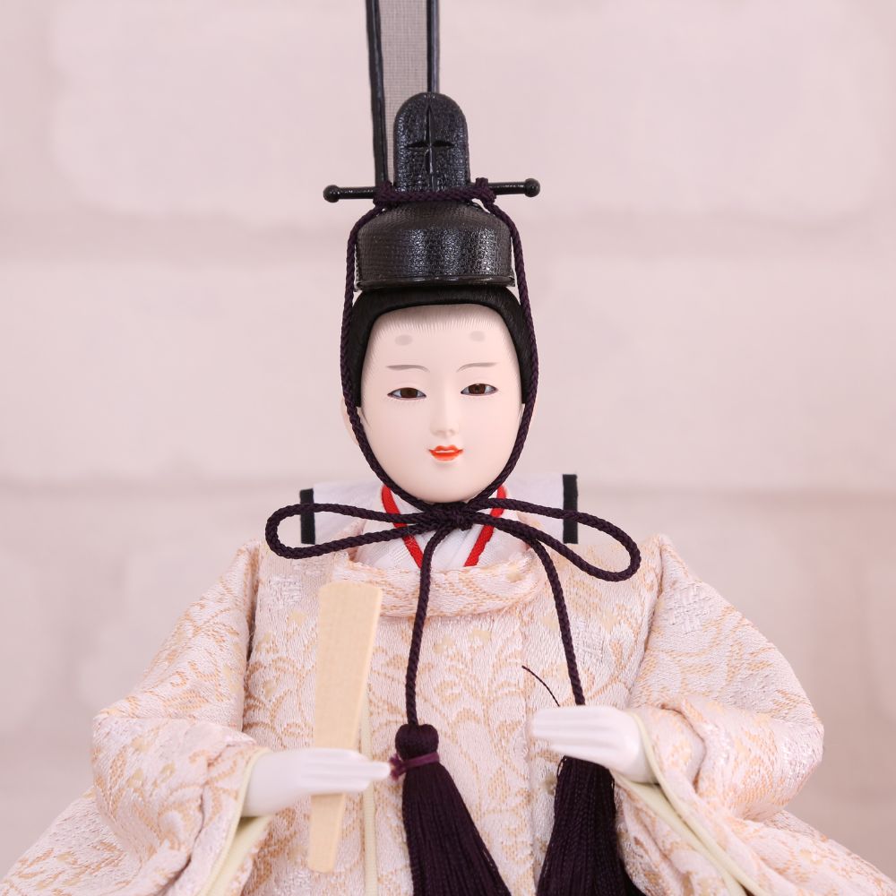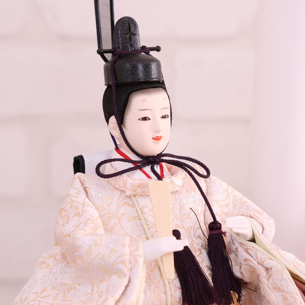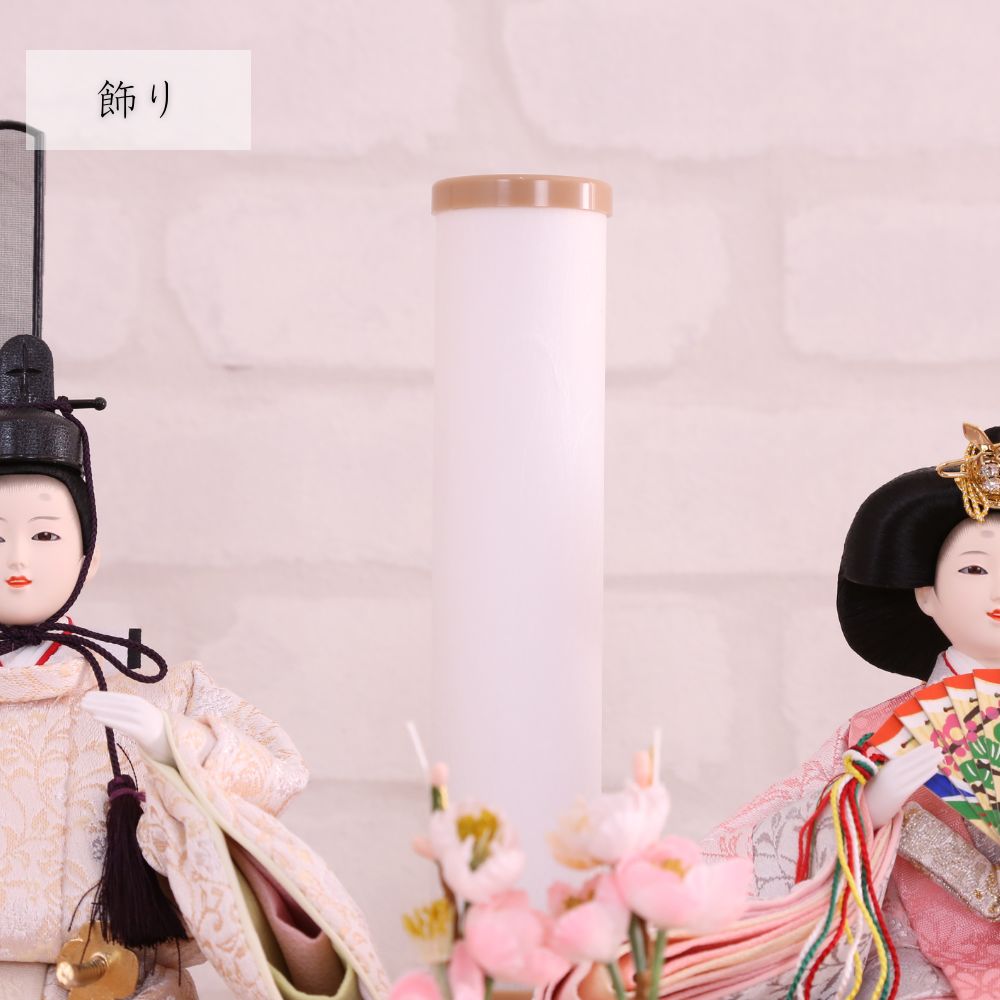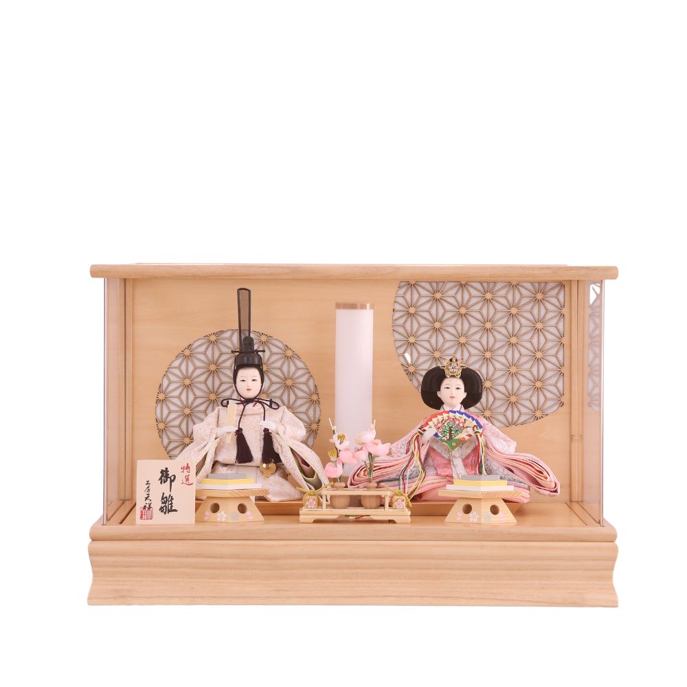 桐製枠のアクリルケースのバックには麻の葉文様柄がデザインされ、洋室にも合わせやすい親王飾りケース入りです。 また、男雛にはクリーム系のお色をベースに、女雛は淡いピンク色を基調とし、縁起が良いとされる唐草文様柄を織り出した京都西陣織物のお着物のお雛様を合わせています。 さらには、前飾りの菱三宝は現代風にアレンジされて木製で統一感を出し、スタイリッシュな円柱型行灯も付いて、おしゃれな高級ケース飾りの雛人形に仕上がっています。 現代のお住まいのインテリアとも相性がよい、親王飾りの雛人形です。