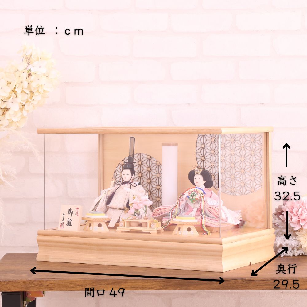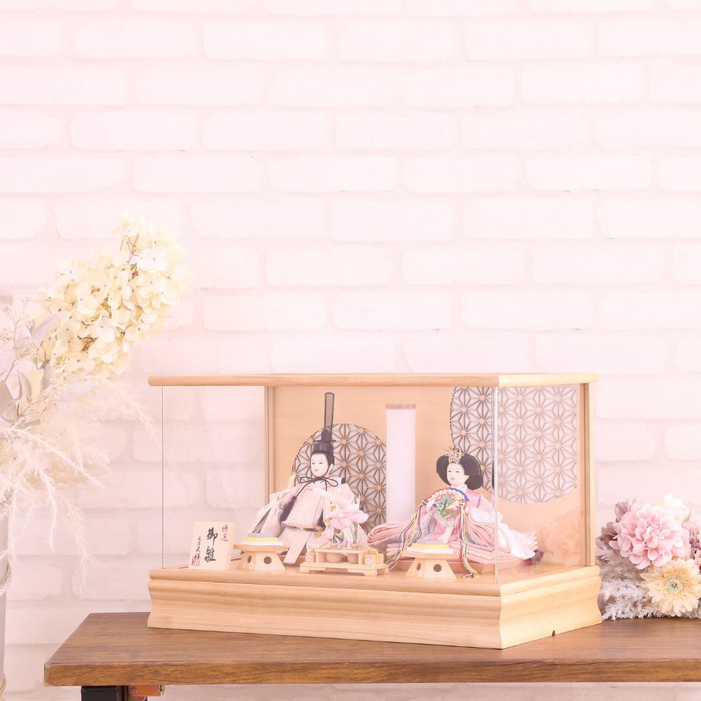 雛人形 コンパクト 木目 桐材使用 アクリル ケース入り 横幅49cm ひな人形 高級ケース飾り 親王飾り 芥子親王 かわいい おしゃれ ナチュラル モカ アースカラー くすみカラー 北欧風 お祝い 初節句 ひな祭り 桃の節句 四角ケース