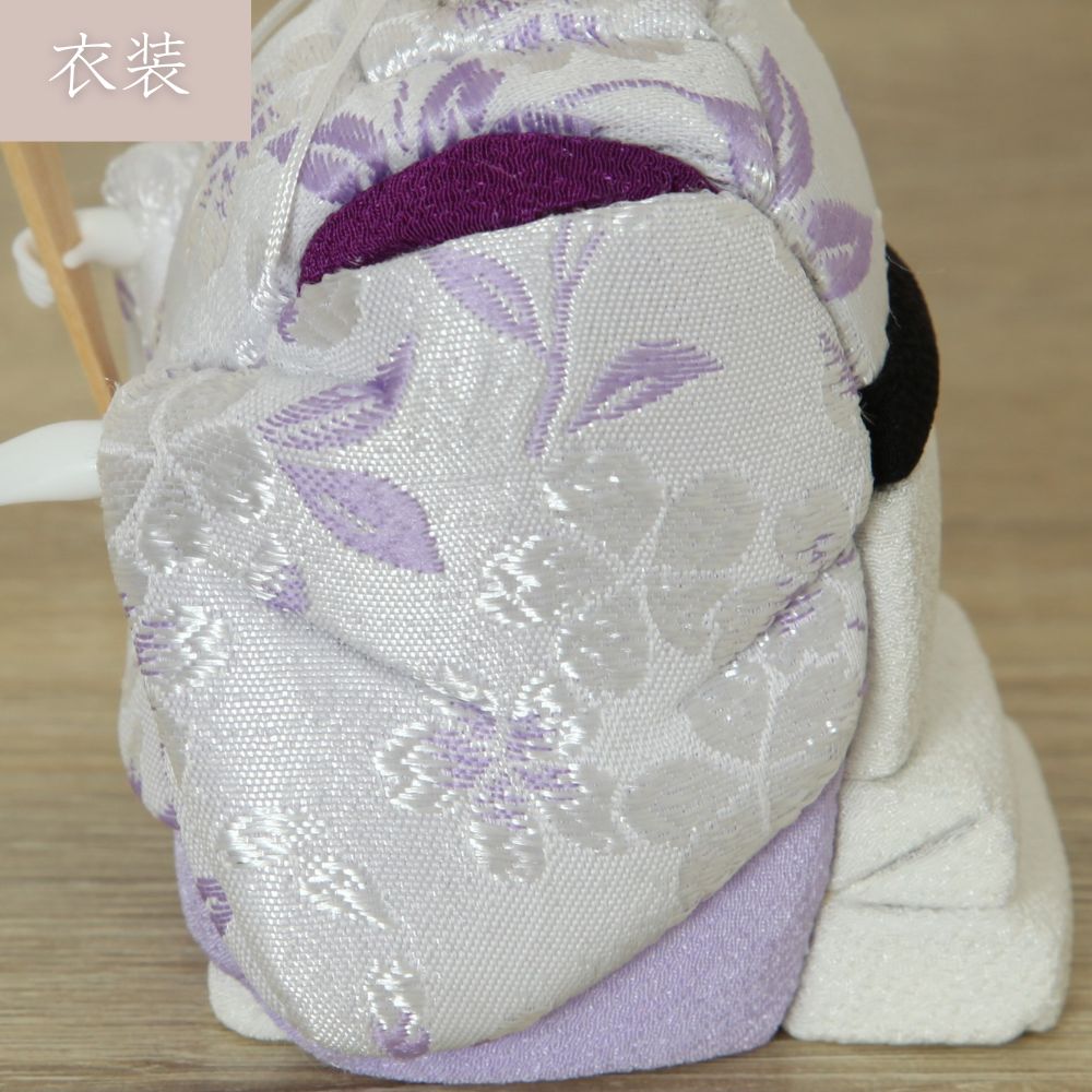 小さいながらも、京都西陣織物で仕立てたお着物をお召しになり、かわいいお顔のお雛様。