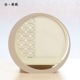その木目込み雛人形に合わせるのは、三日月の形をしたキナリ色の台屏風セット。そこには、七宝柄を配して縁起の良さも演出しています。
