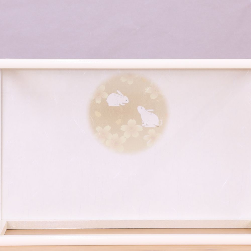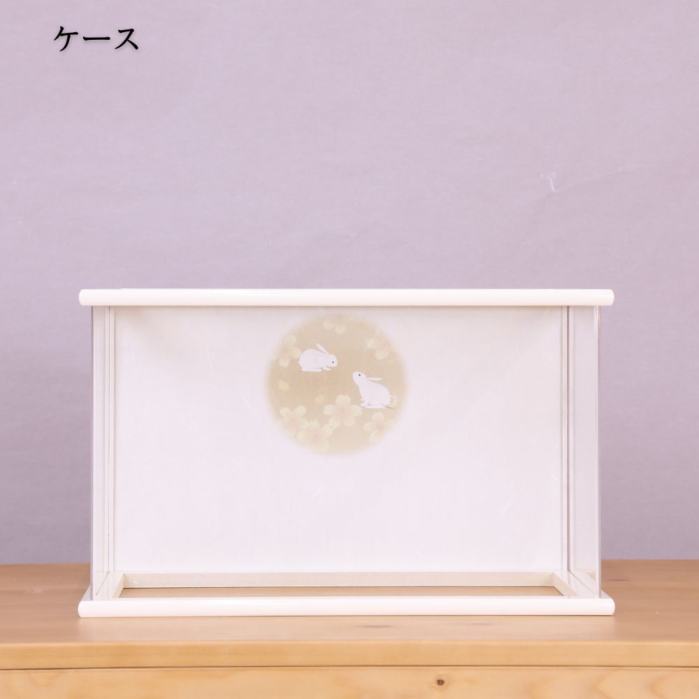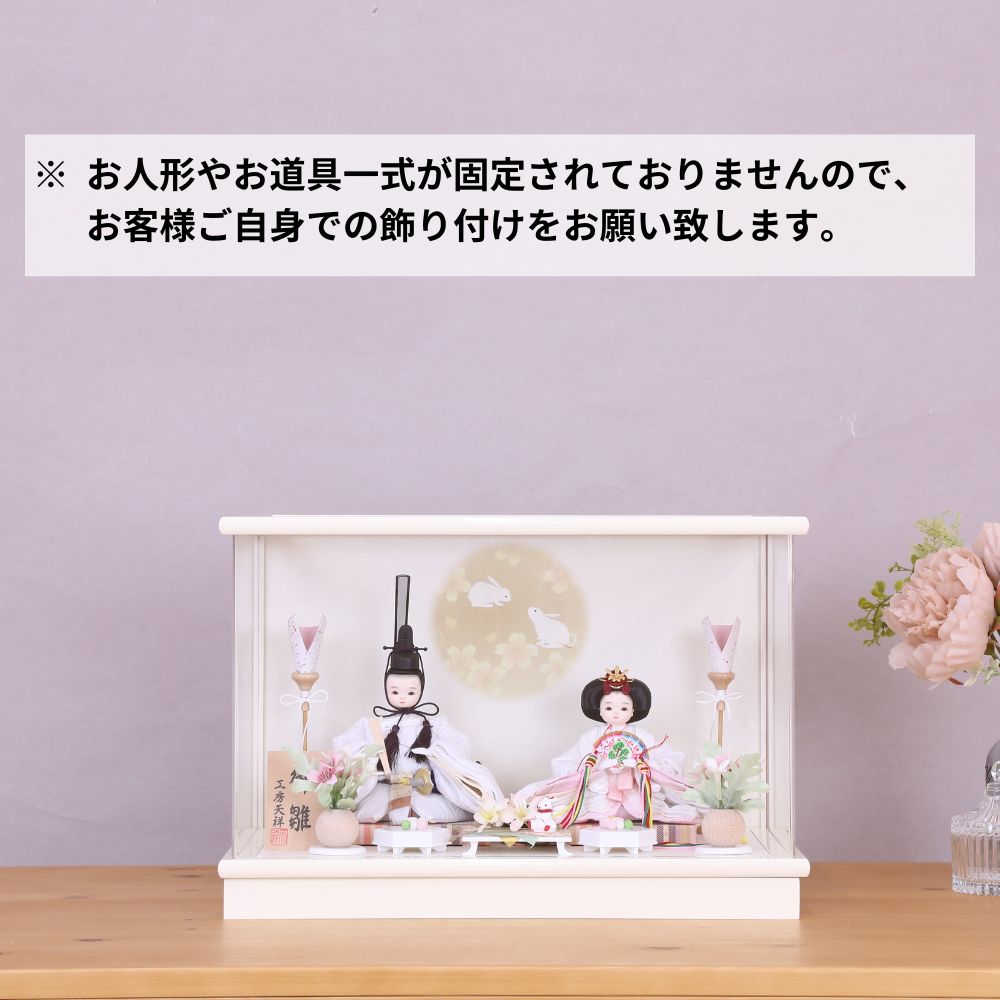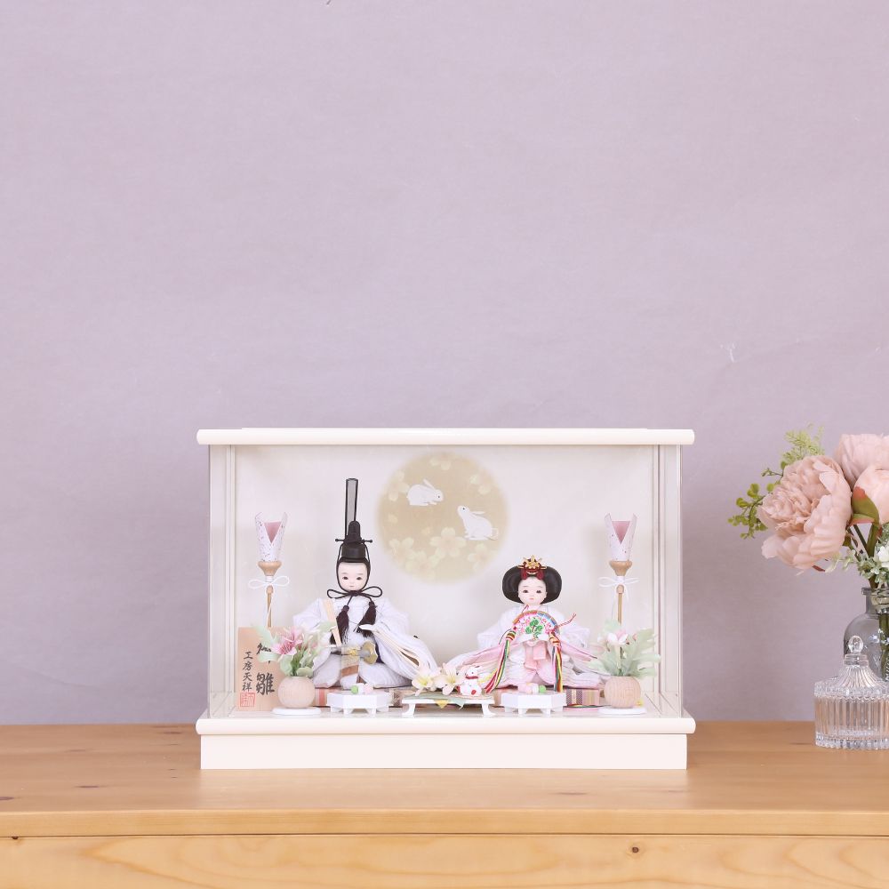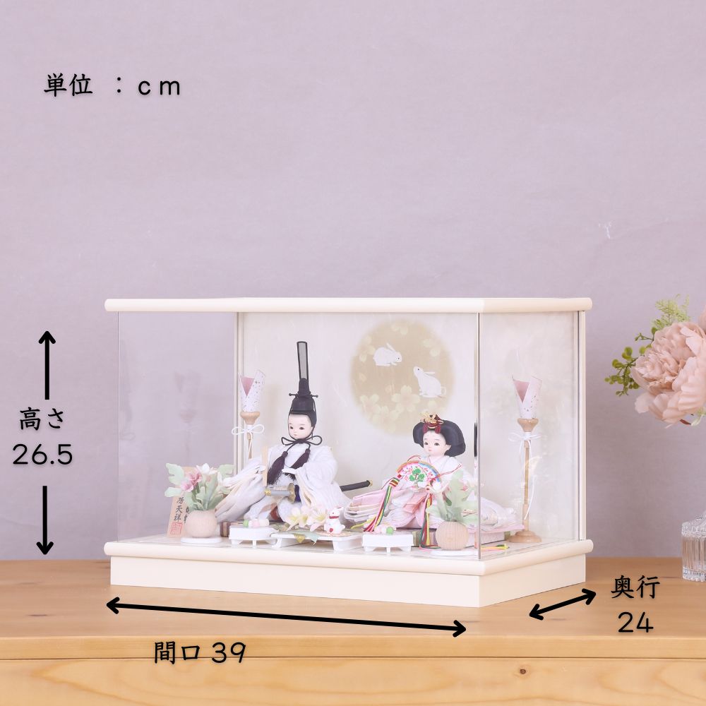 うさぎ柄の白枠アクリルケースは、洋室にも合わせやすいコンパクトな親王飾りケース入りです。 また、男雛、女雛にともに白色を基調とし高貴な伝統文様の雲立涌柄を織り出した上質なお着物です。 そして、当店限定数のみのお顔でおめめが大きく、かわいい表情が魅力的。現代風に仕上げた雛人形です。 さらには、前飾りにもウサギがちょこんとお座りした、かわいいケース飾りにこだわった雛人形です。 場所を選ぶことなくコンパクトにそして気軽に飾れる、フローリングのお部屋とも相性が良い、親王飾りの雛人形です。サイズ
