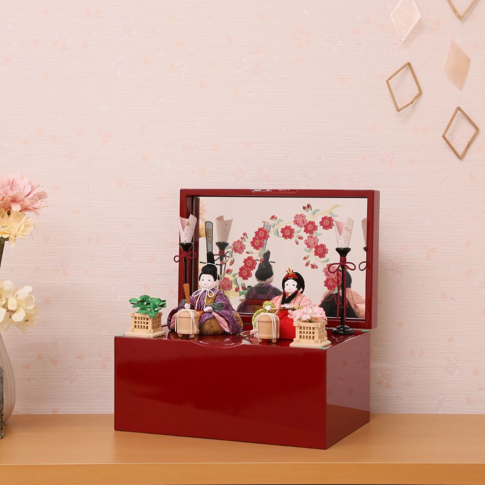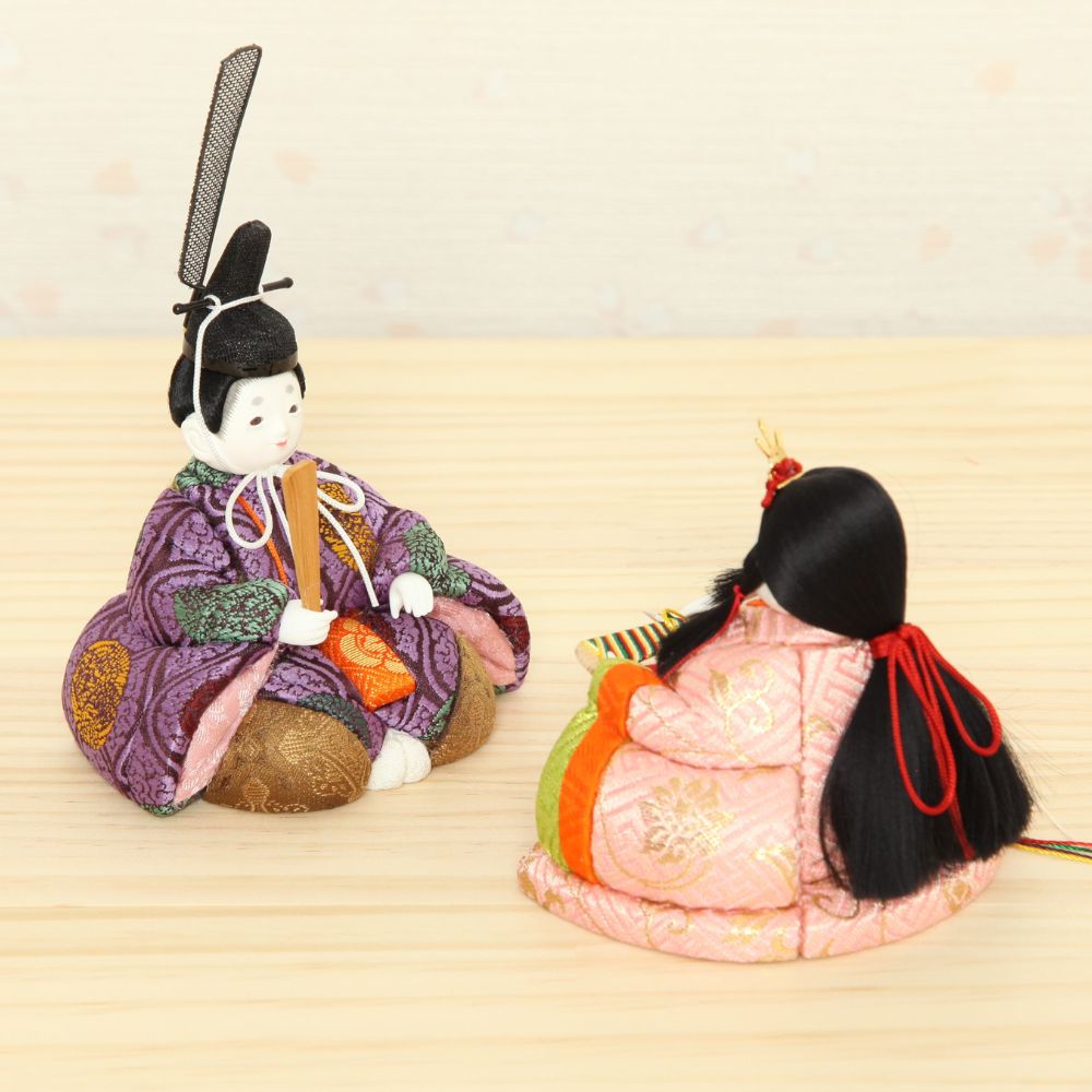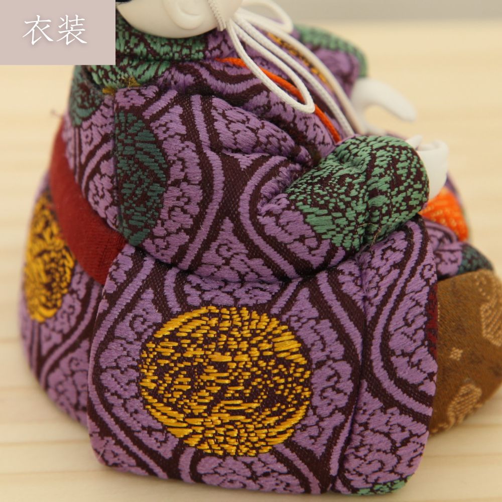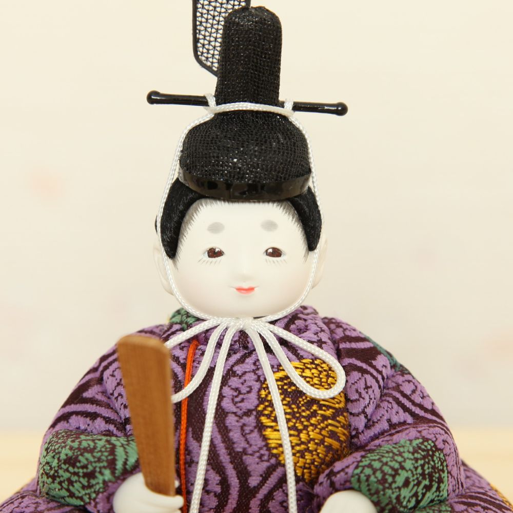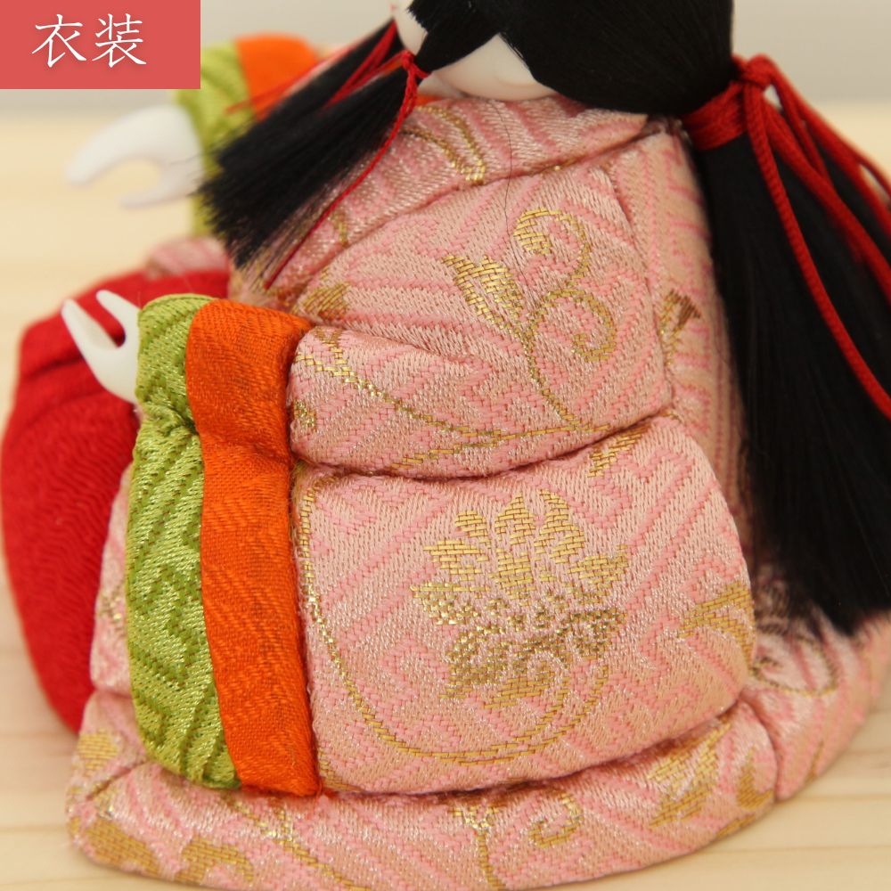 高級感ある溜塗りの鏡付き収納飾りよって、より華やかになったお衣裳は、京都西陣金襴織物を用いています。男雛には紫色、女雛にはピンク色に伝統的文様柄が配されたお着物で、福がたくさん舞い込むような、かわいいお顔のお雛様です。