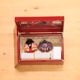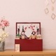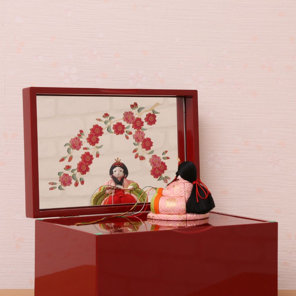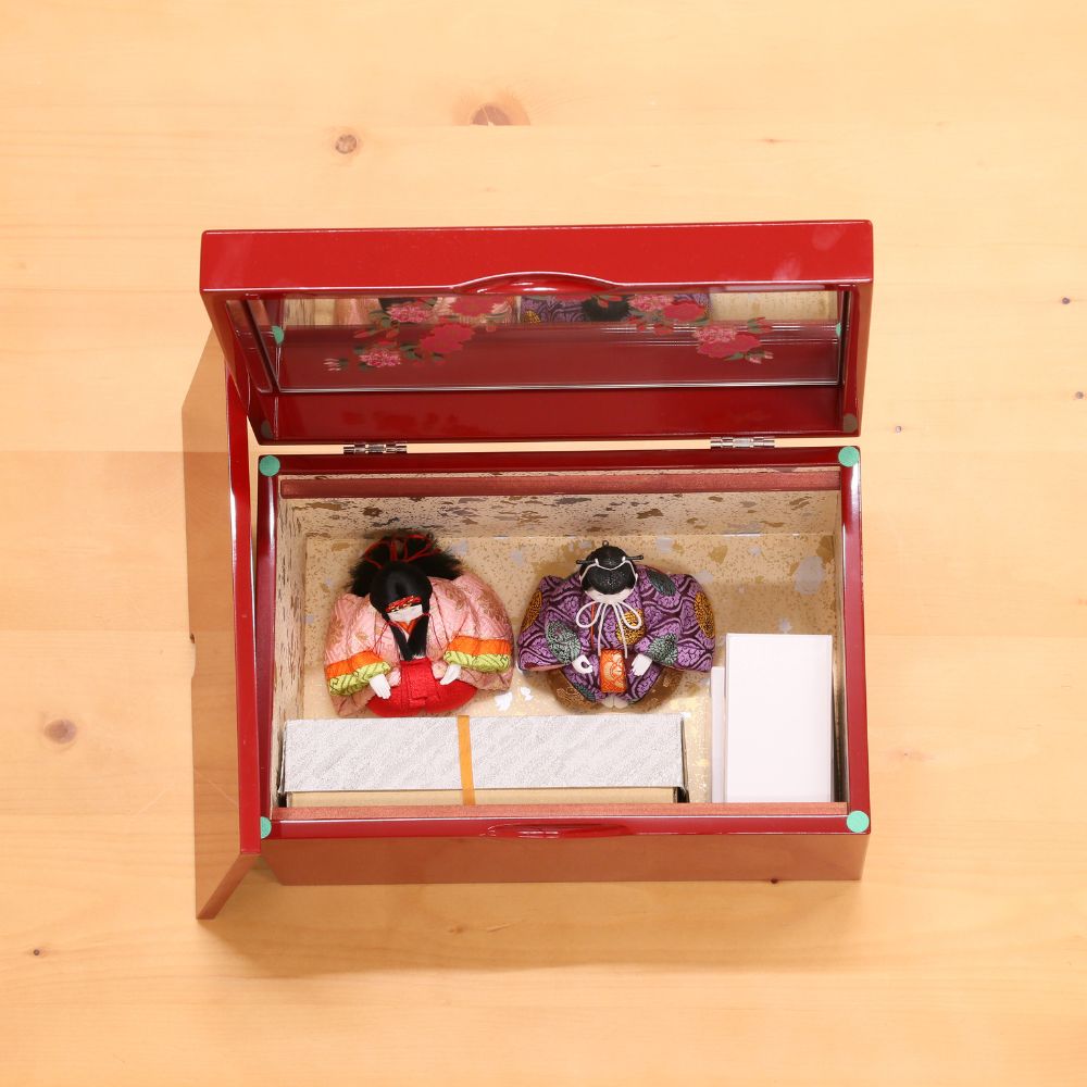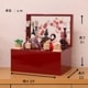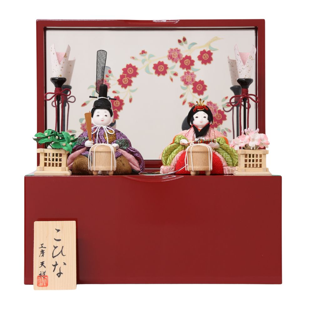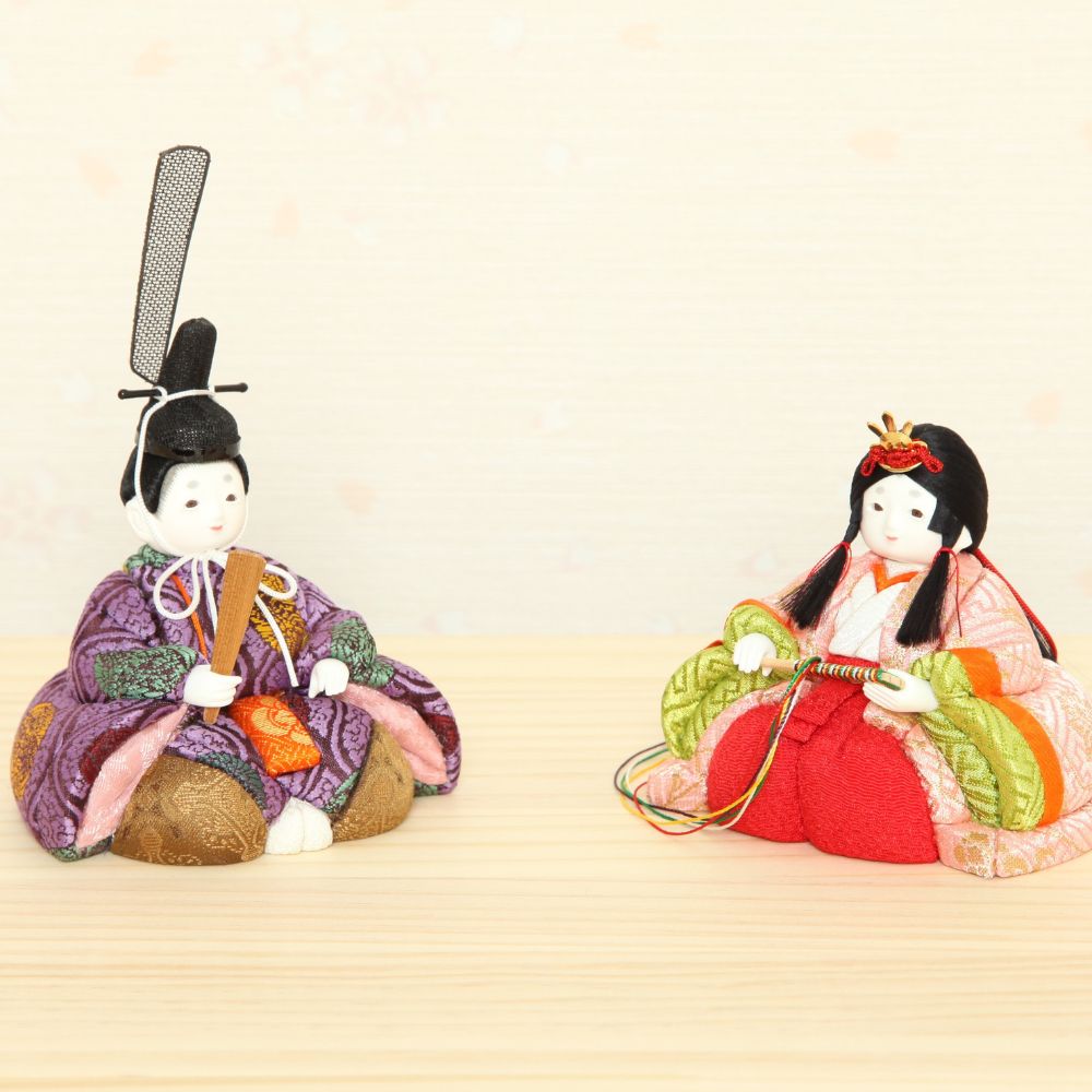 高級感ある溜塗りの鏡付き収納飾りよって、より華やかになったお衣裳は、京都西陣金襴織物を用いています。男雛には紫色、女雛にはピンク色に伝統的文様柄が配されたお着物で、福がたくさん舞い込むような、かわいいお顔のお雛様です。