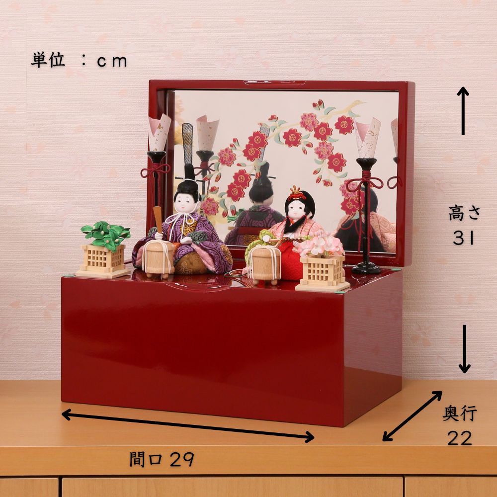 木目込み人形では珍しい?入り目?で、ちょっぴりタレ目。コロンとしたフォルムに、かわいいお顔のお雛様。 間口(横幅)29×奥行22×高さ31(cm)サイズ