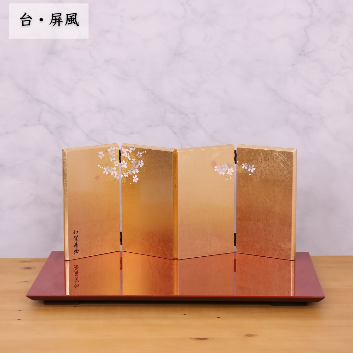 加賀蒔絵で描かれた小桜柄の美しい高岡塗り金屏風セットに、一目で分かる上質感、ちりめん生地の中でも最高級とされる丹後ちりめん絹織物から仕立てた衣装のお雛様を合わせています。