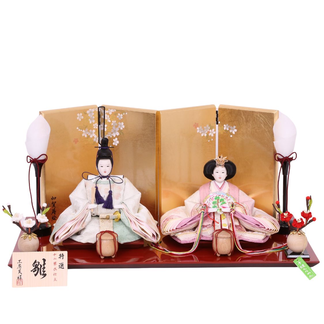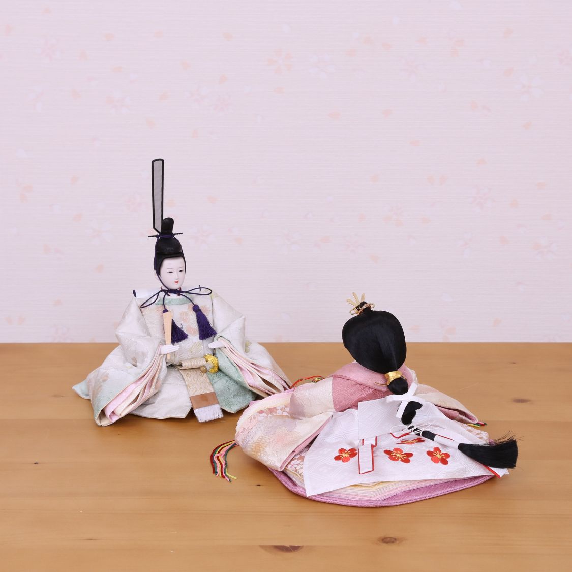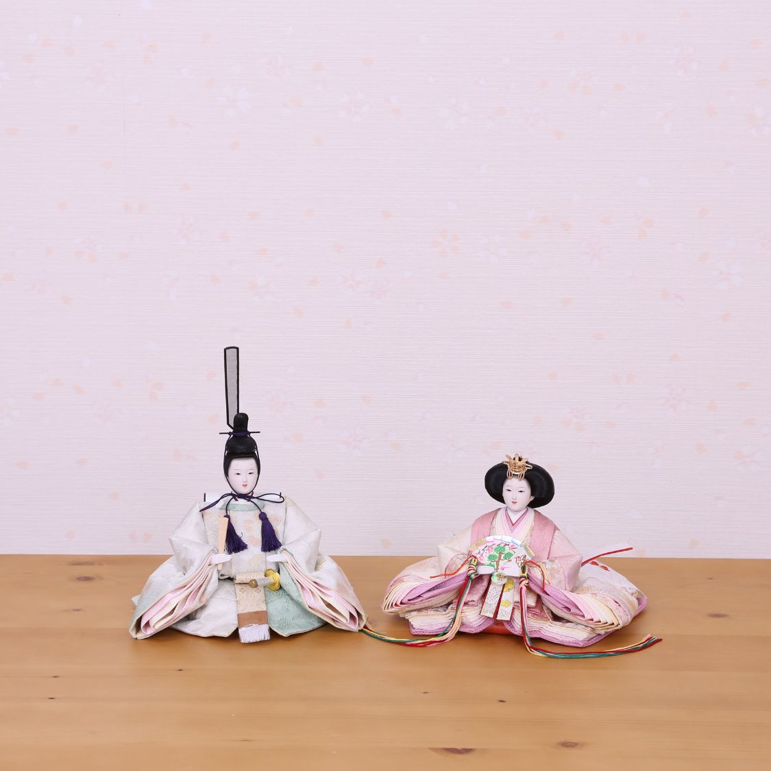 男雛には浅緑色、女雛には淡いピンク色。ちりめん独特のやわらかい風合いと、春らしい色合わせのお衣裳が、高級金屏風によってより際立つ人気の雛人形です。