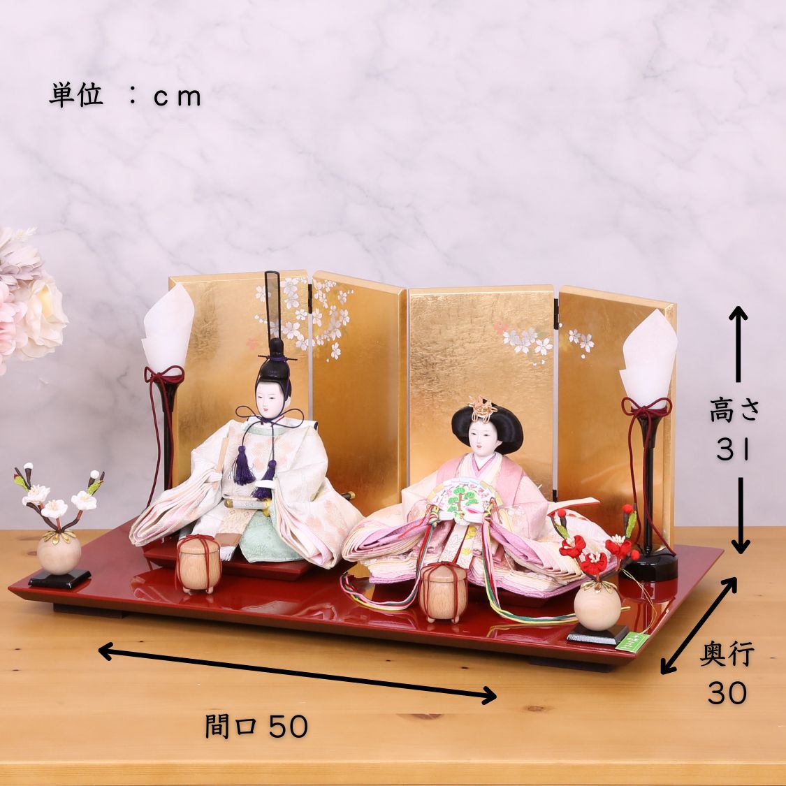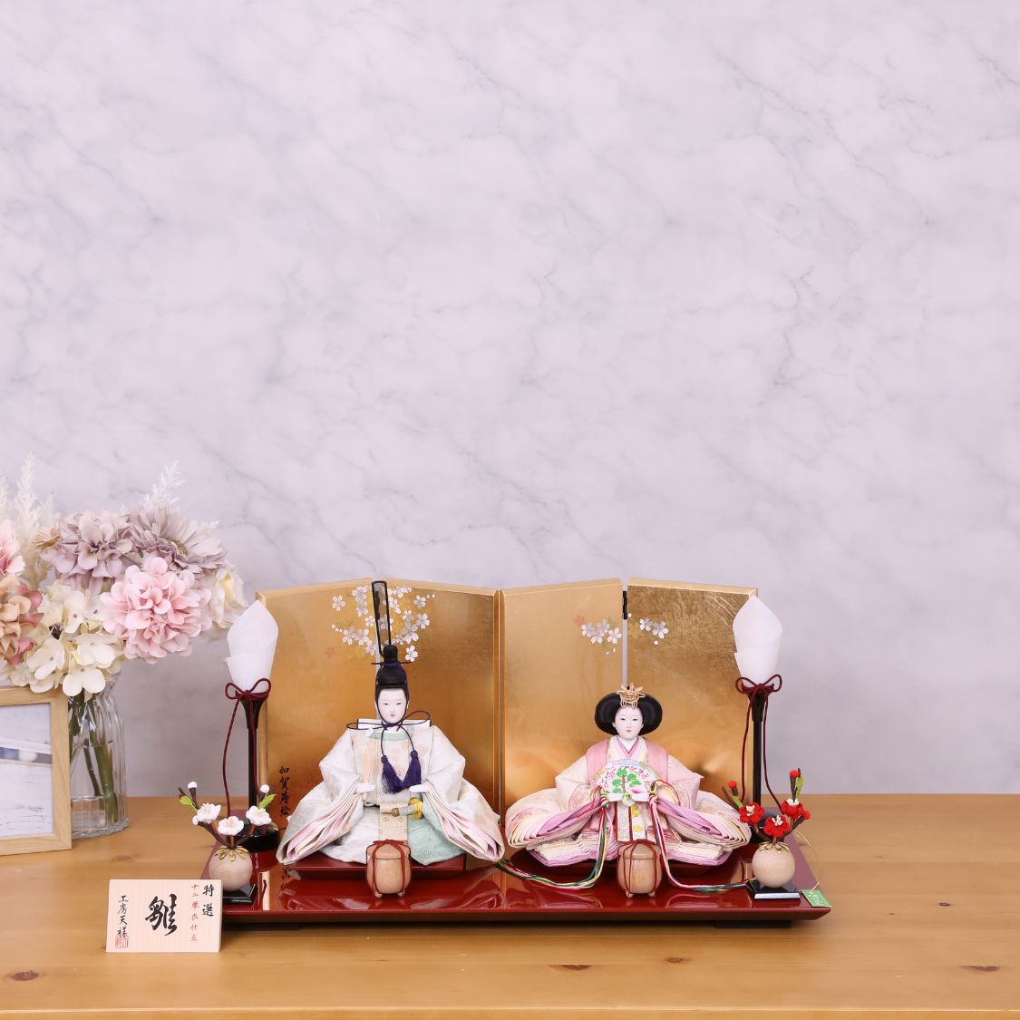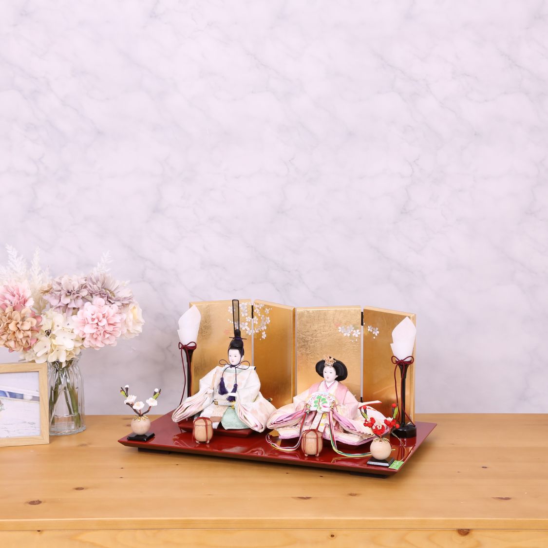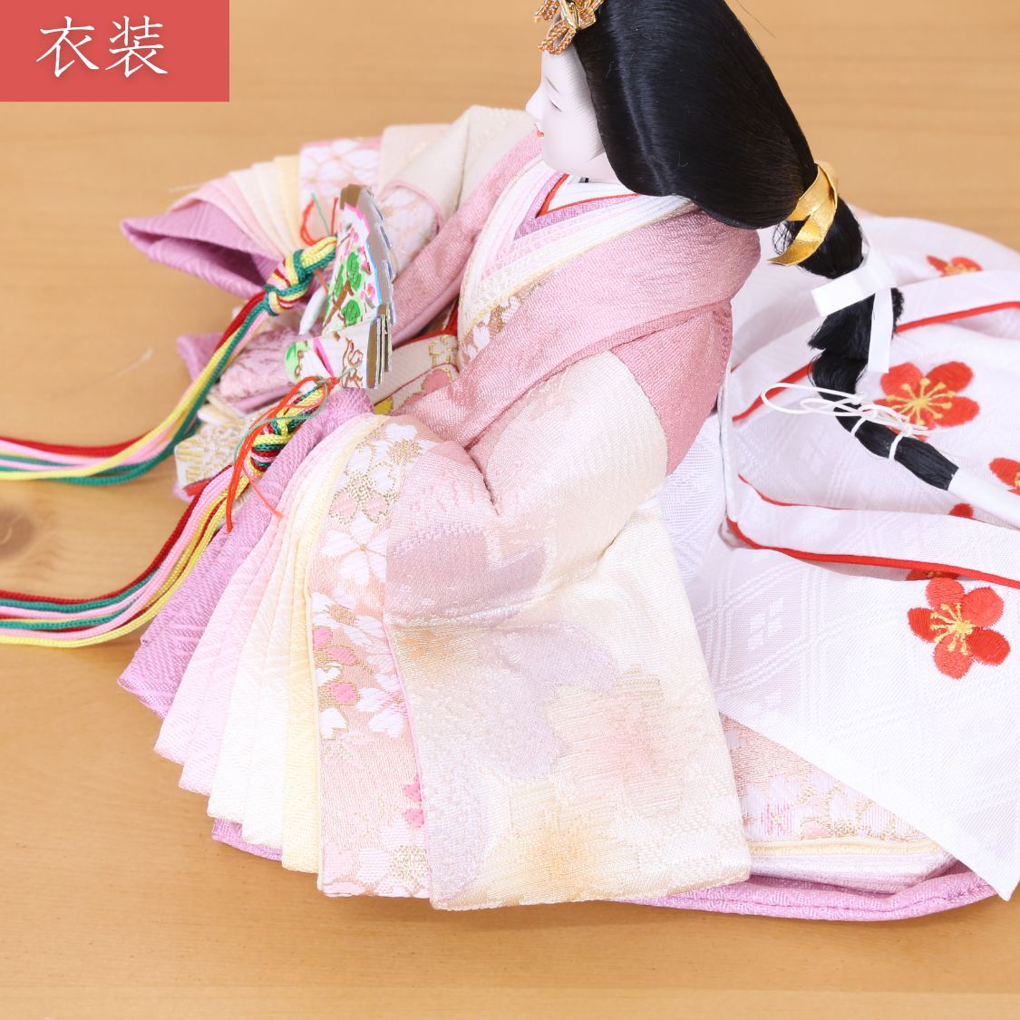 男雛には浅緑色、女雛には淡いピンク色。ちりめん独特のやわらかい風合いと、春らしい色合わせのお衣裳が、高級金屏風によってより際立つ人気の雛人形です。