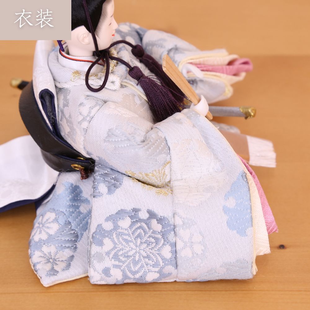 雪輪柄の白枠アクリルケースは、洋室にも合わせやすいコンパクトな親王飾りケース入りです。 また、男雛、女雛にともに水色を基調とし高貴な伝統文様柄を織り出した上質なお着物です。 そして、当店限定数のみのお顔でおめめが大きく、かわいい表情が魅力的。現代風に仕上げた雛人形です。 かわいいケース飾りにこだわった雛人形です。 場所を選ぶことなくコンパクトにそして気軽に飾れる、フローリングのお部屋とも相性が良い、親王飾りの雛人形です。