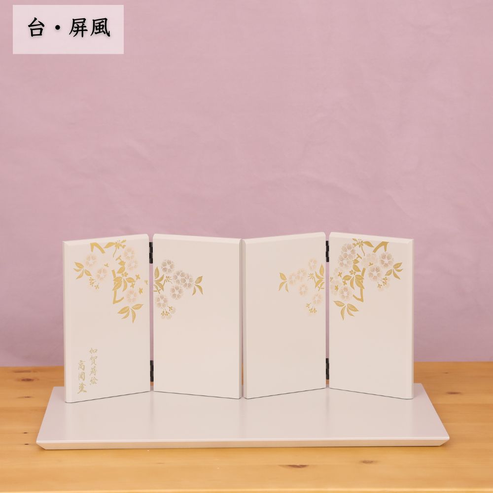 加賀蒔絵で描かれた“琳桜”柄の美しい高岡塗り台屏風セットに、一目で分かる上質感、正絹ちりめん織物から仕立てた衣装のお雛様を合わせています。