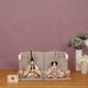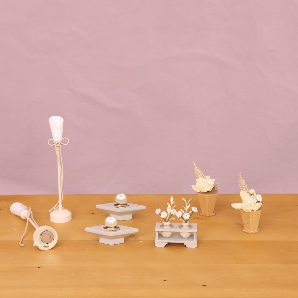 さらに、お道具の前飾りの菱三宝は現代風にアレンジしてグレージュ系で統一しています。