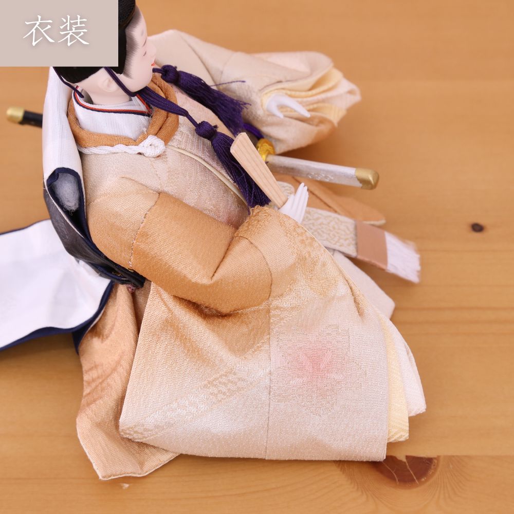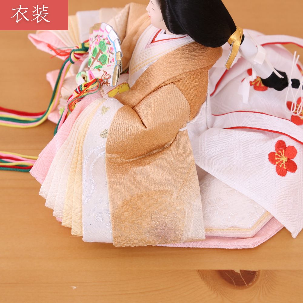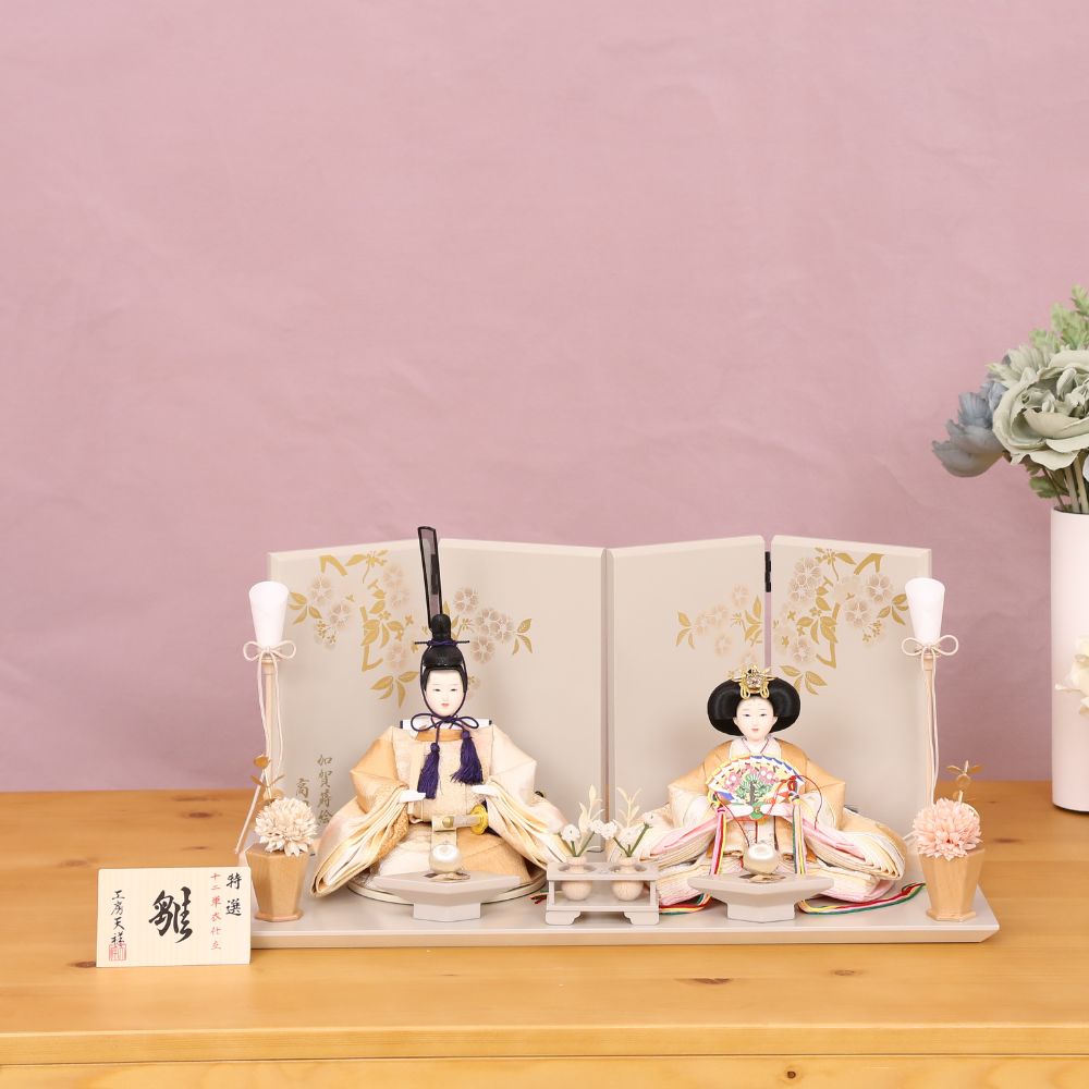 男雛には浅緑色、女雛には紫がかったピンク色に、桜柄があしらわれた気品あるデザインのお衣裳が、高級感ある加賀蒔絵・溜め塗り屏風と相性の良い人気の雛人形です。