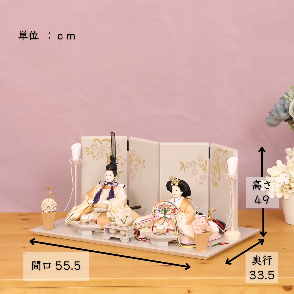 そして、美しい雰囲気と可愛らしい表情のどちらも兼ね備えているお顔は、工房天祥オリジナル、人気の親王飾りです。 間口(横幅)45×奥行26×高さ22(cm)サイズ