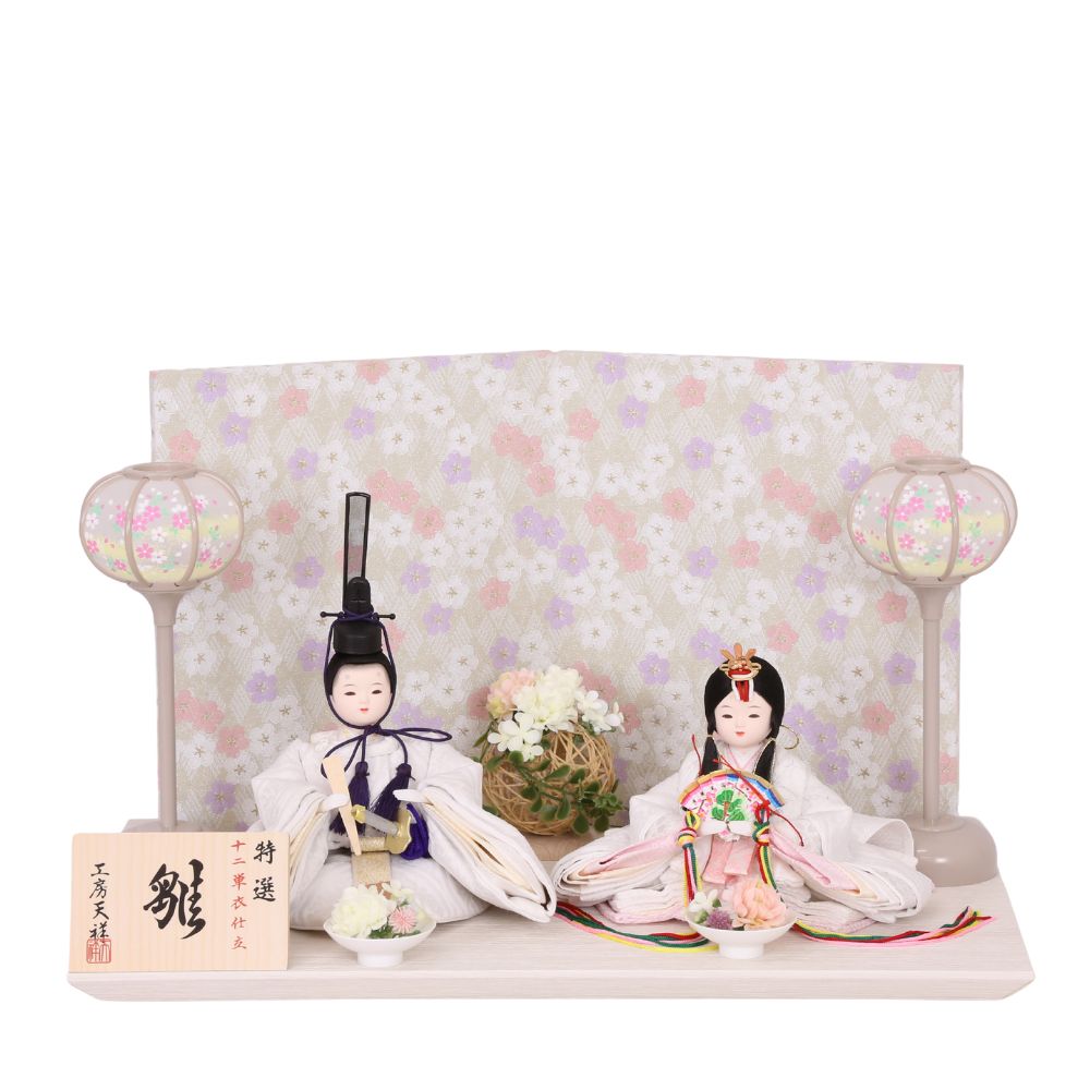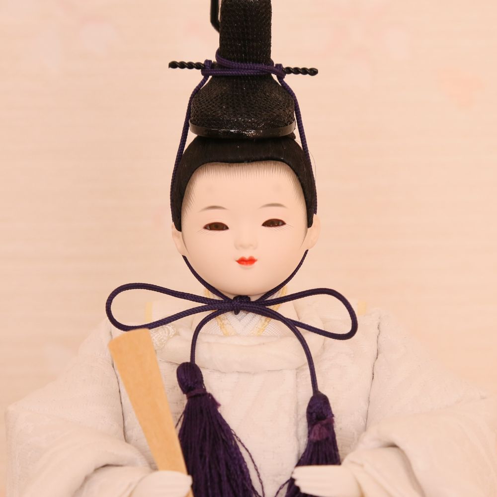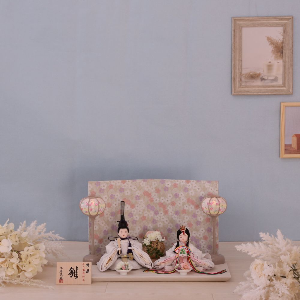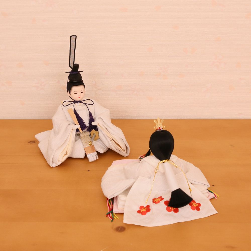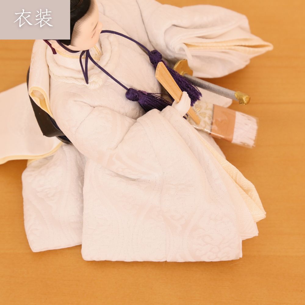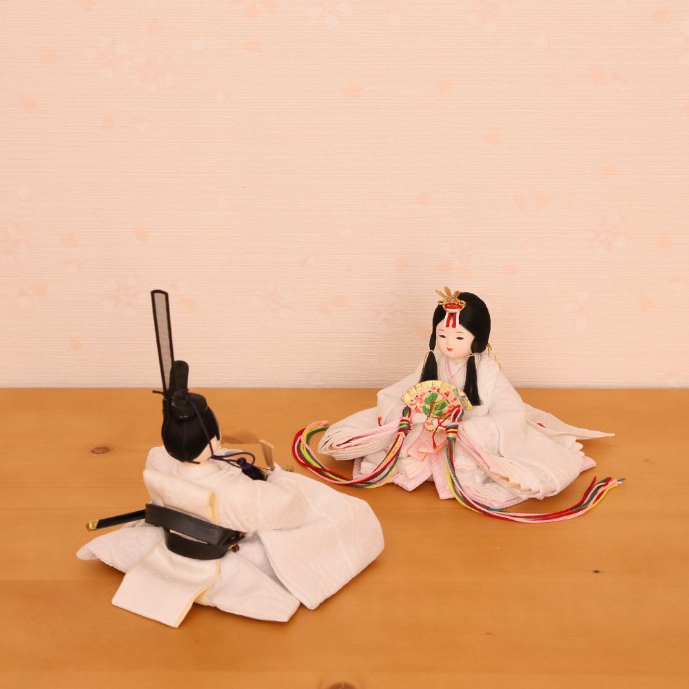 男雛、女雛にともに白色を基調とし、高貴な伝統文様の?雲立涌?柄を織り出したお着物お雛様を合わせています。京都西陣裂地を用いた上質なお着物は、小さいながらも華やかさが際立つ親王飾りです。