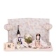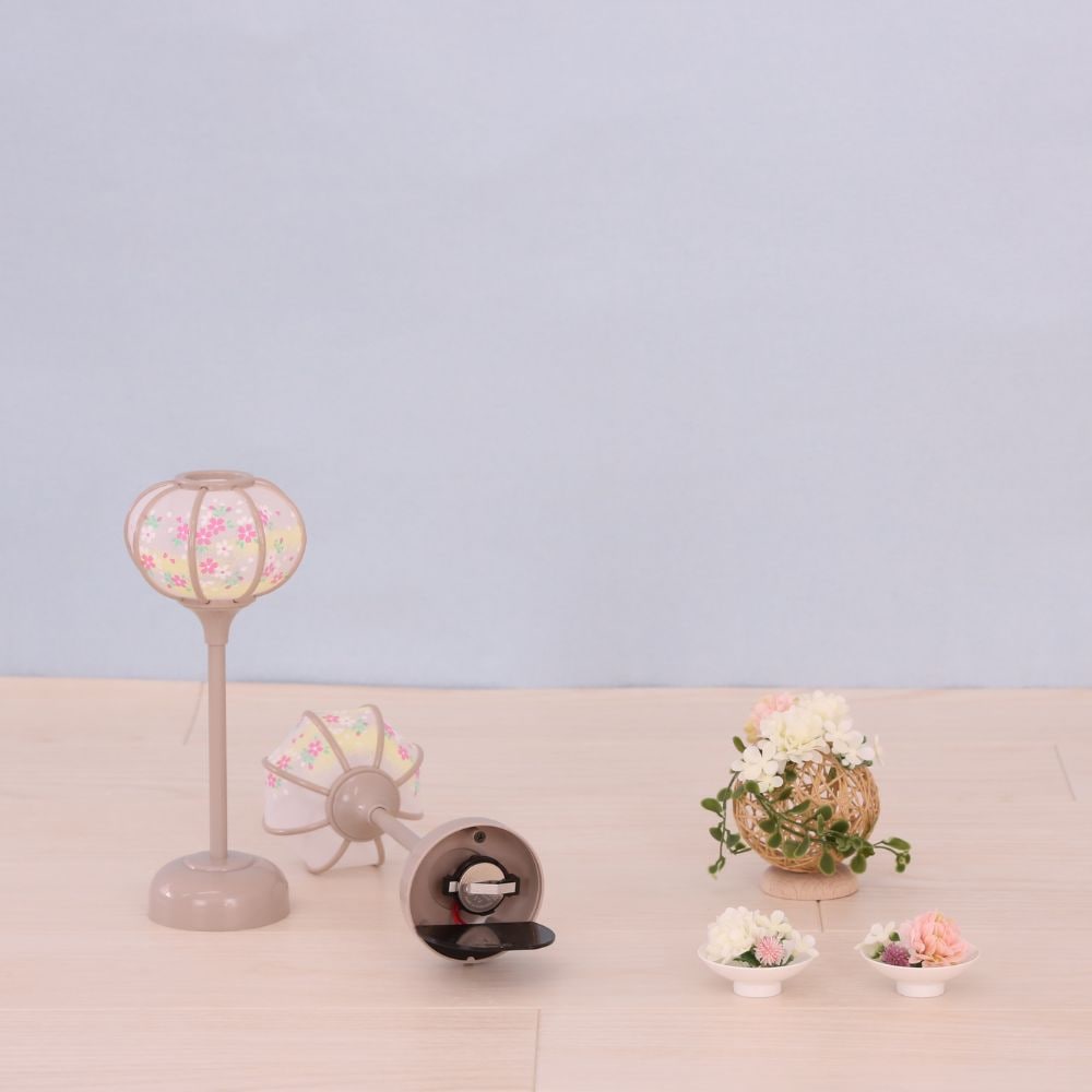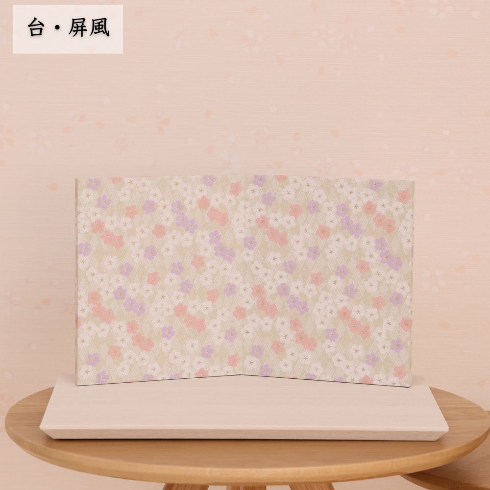 小さいサイズの親王飾り衣装着雛人形。今流行りのグレージュ系の屏風に合わせたお洒落な色合いの雪洞や、豪華なカゴ花飾りが付いた、コンパクトな二曲花柄屏風 雛飾りです。