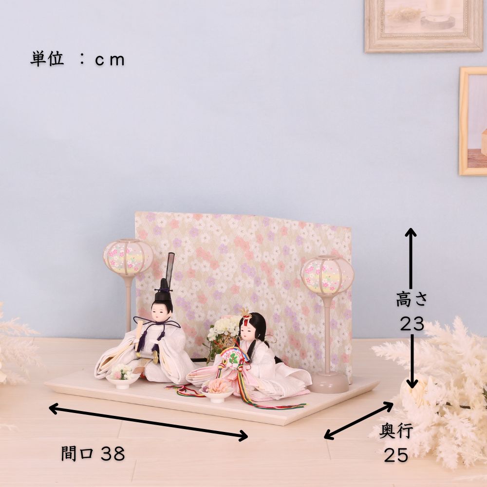 簡単に飾れて、コンパクトに収納できる雛人形をお求めの方に、お薦め人気商品です。 間口(横幅)38×奥行25×高さ23(cm)サイズ