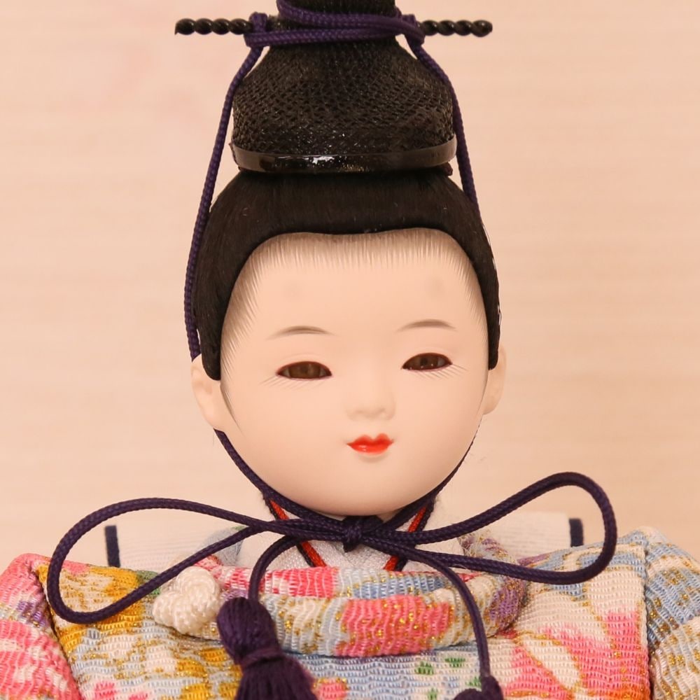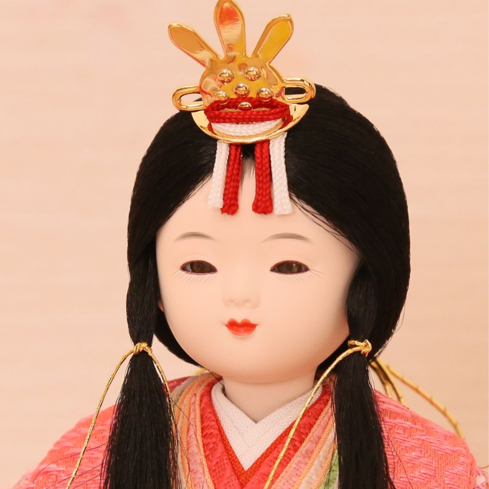 また、当店オリジナルお顔の中でも人気、割り毛スタイルは衣装着ひな人形として珍しいお下げ髪。ぱっちりした目に可愛らしい表情で、親しみやすさを表現した雛人形です。