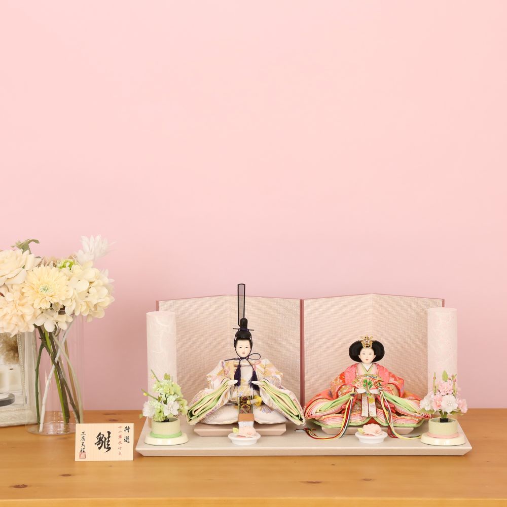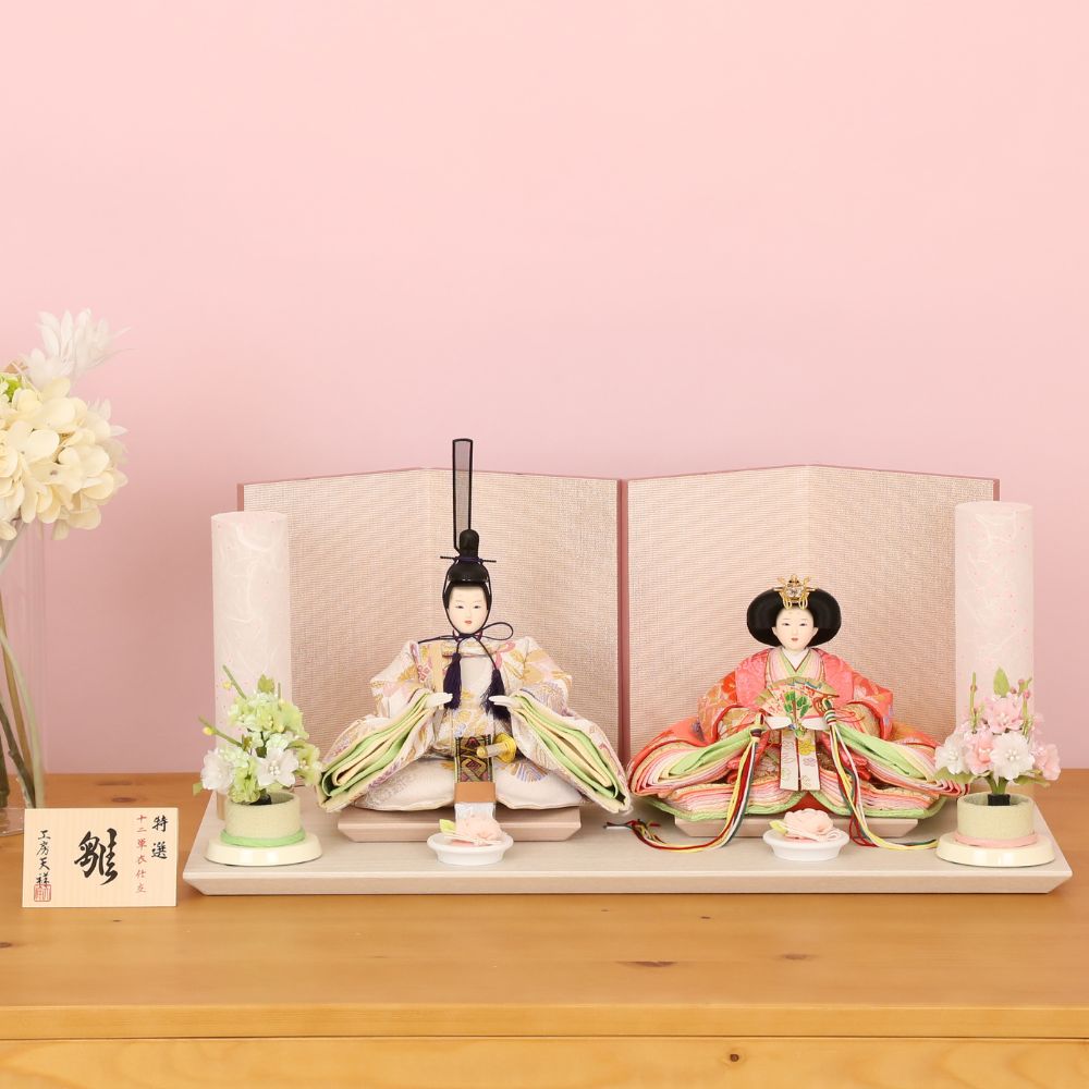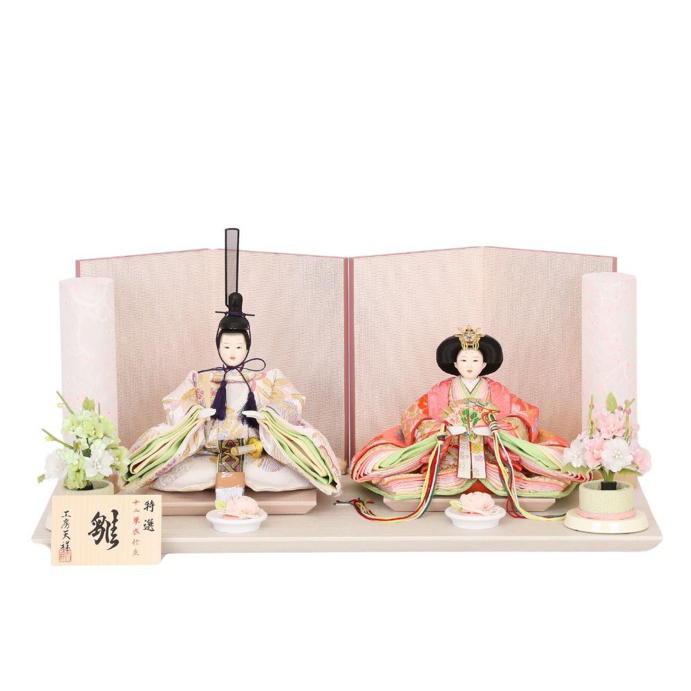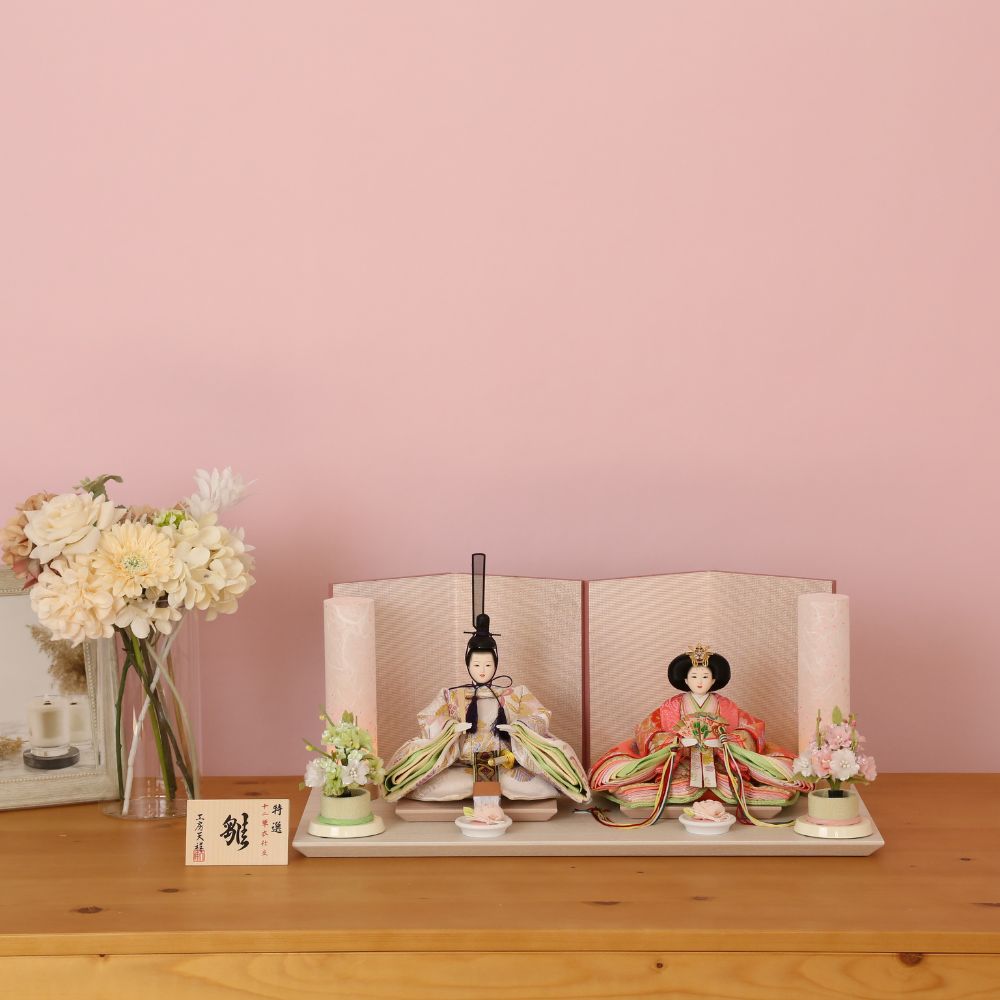 落ち着いた薄めピンク色に“本銀紗”デザインの屏風に、男雛には白地に古典柄、女雛にはピンク色を基調とし桜柄を織り出した親王飾りです。