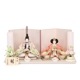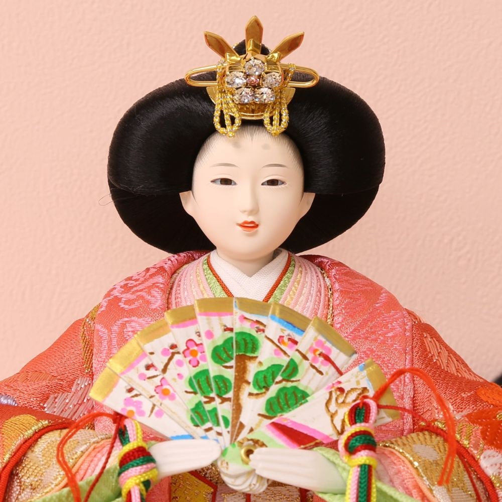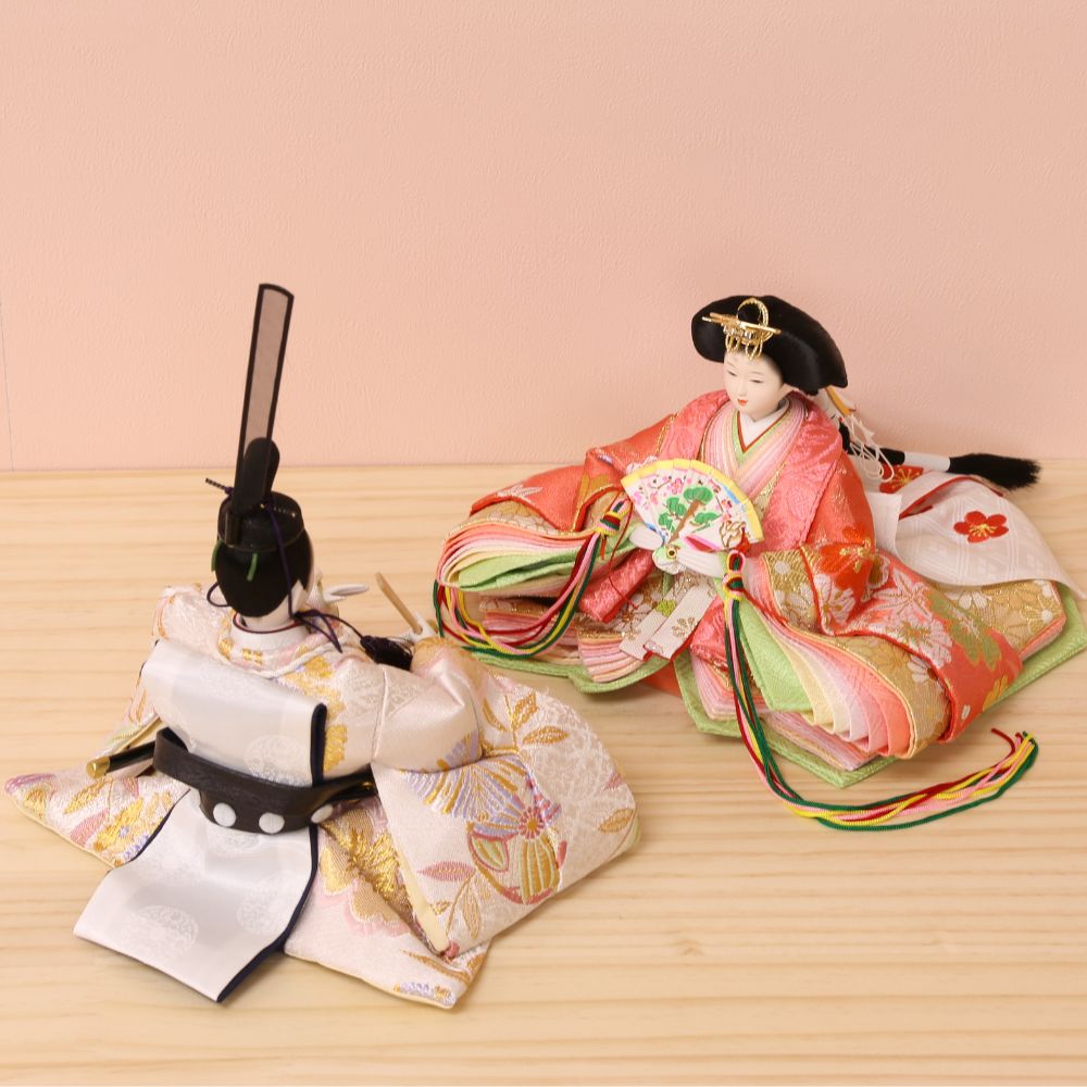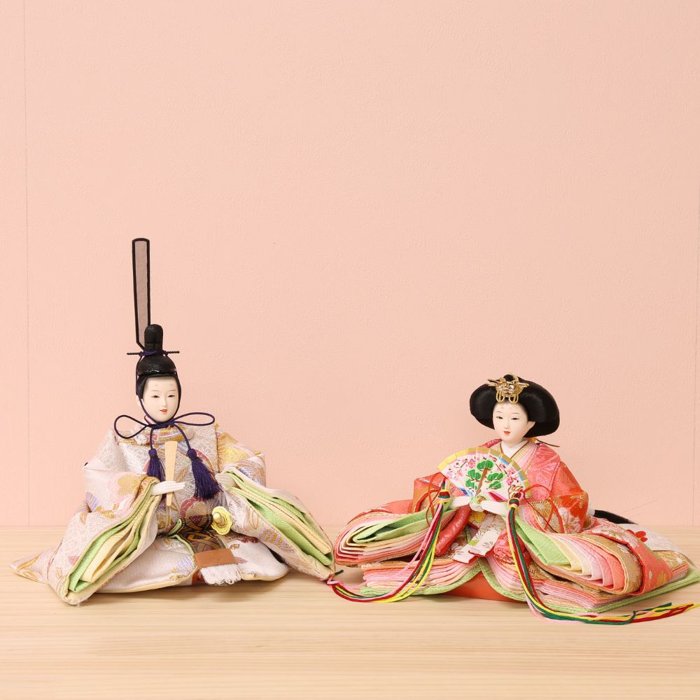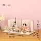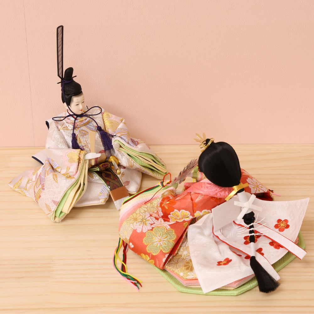 落ち着いた薄めピンク色に“本銀紗”デザインの屏風に、男雛には白地に古典柄、女雛にはピンク色を基調とし桜柄を織り出した親王飾りです。